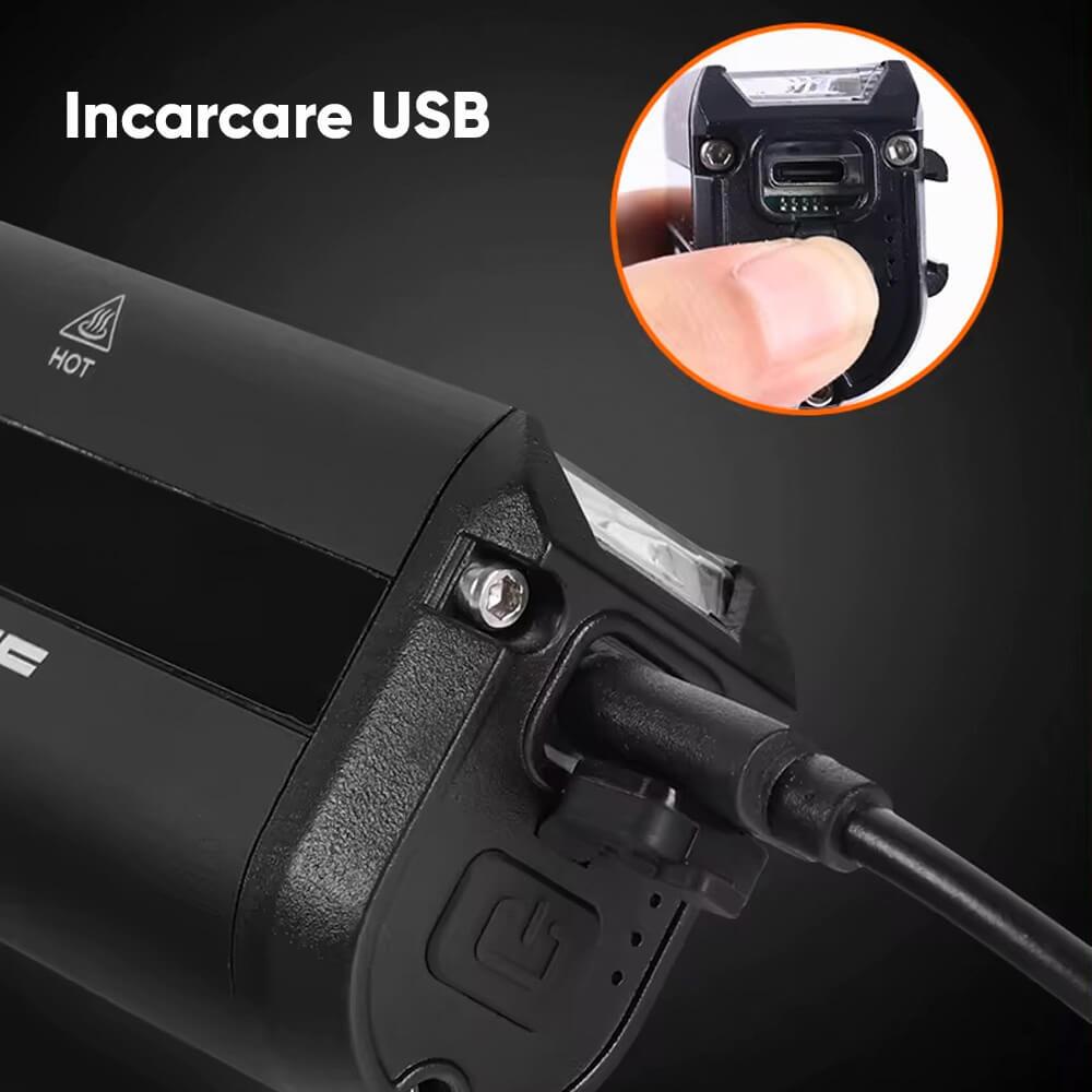 - Echipat cu o baterie reincarcabila de 2000 mAh, farul ofera o durata lunga de utilizare intre incarcari.