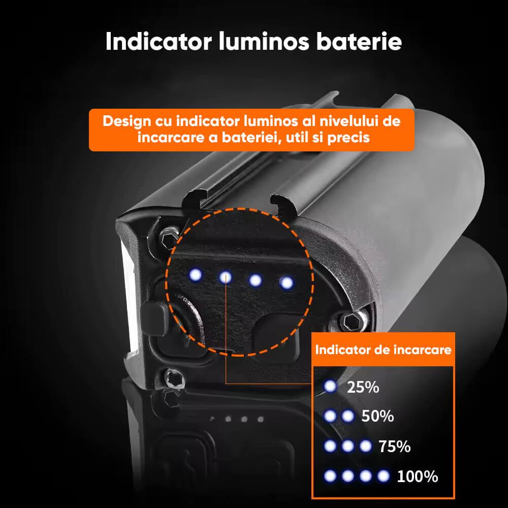- Pentru a cunoaste in orice moment nivelul de incarcare al bateriei, produsul are indicatoare luminoase pentru fiecare din cele 4 etape: 25 %, 50%, 75%, 100%.