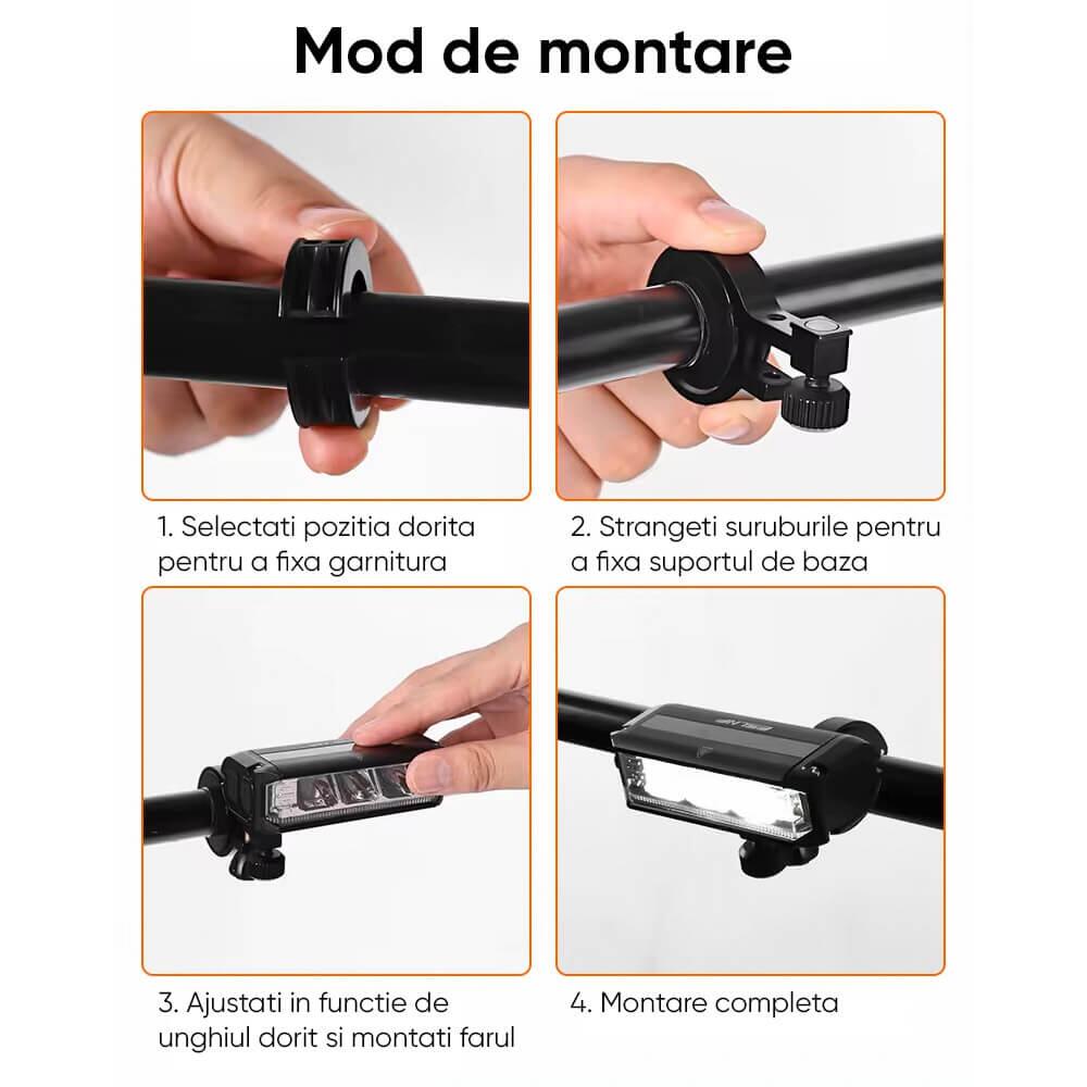 - Farul se monteaza usor pe ghidonul bicicletei, asigurand o fixare stabila si sigura.