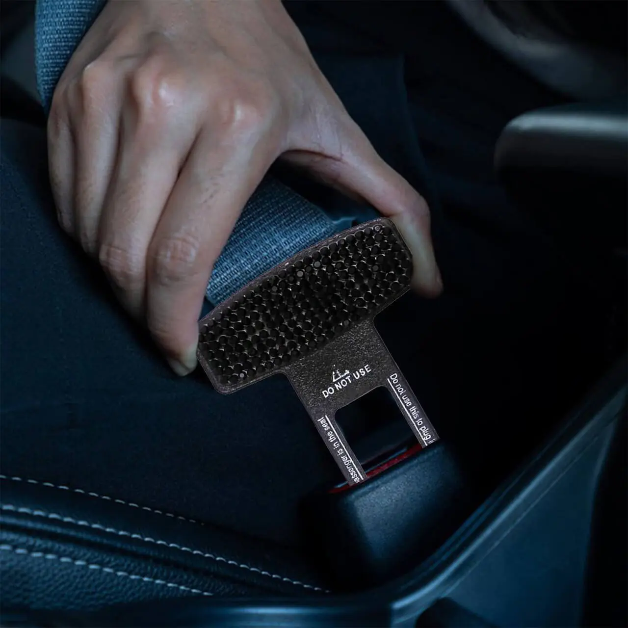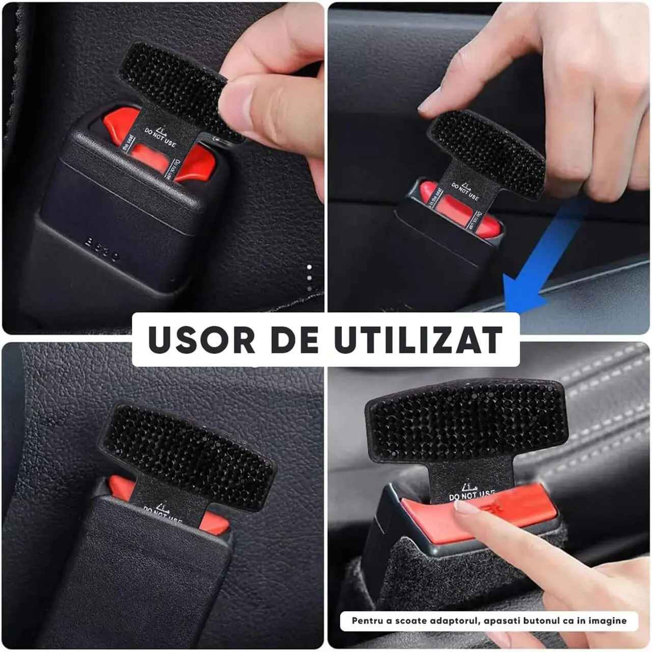 - Adaptorul se introduce in locul centurii de siguranta pentru a opri avertizarile acustice si luminoase din bordul masinii, emise atunci cand nu se foloseste centura de siguranta de catre sofer sau pasagerul din dreapta.