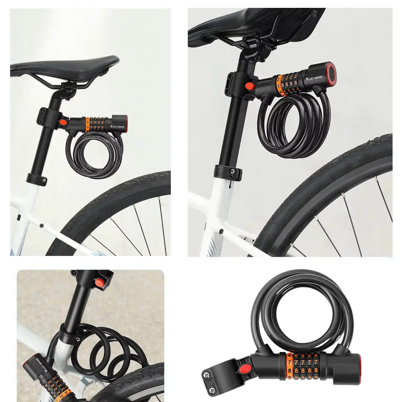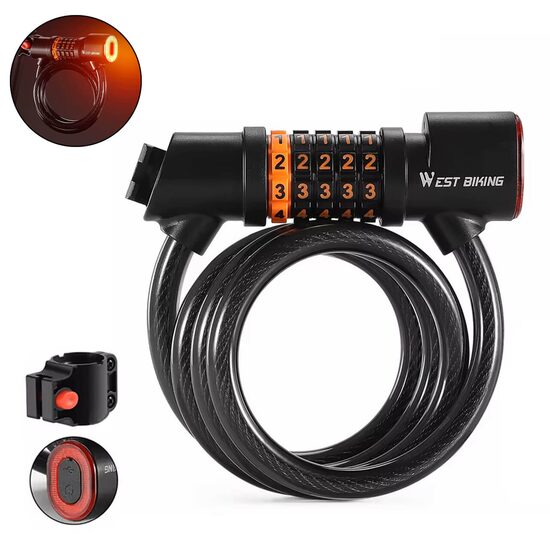 Antifurt bicicleta cu suport prindere si functie lumina stop, baterie reincarcabila, West Biking, grosime 1.2 cm, cablu otel, ABS, PVC, inchidere cu cifru iluminat LED , lungime 120 cm, rezistent
