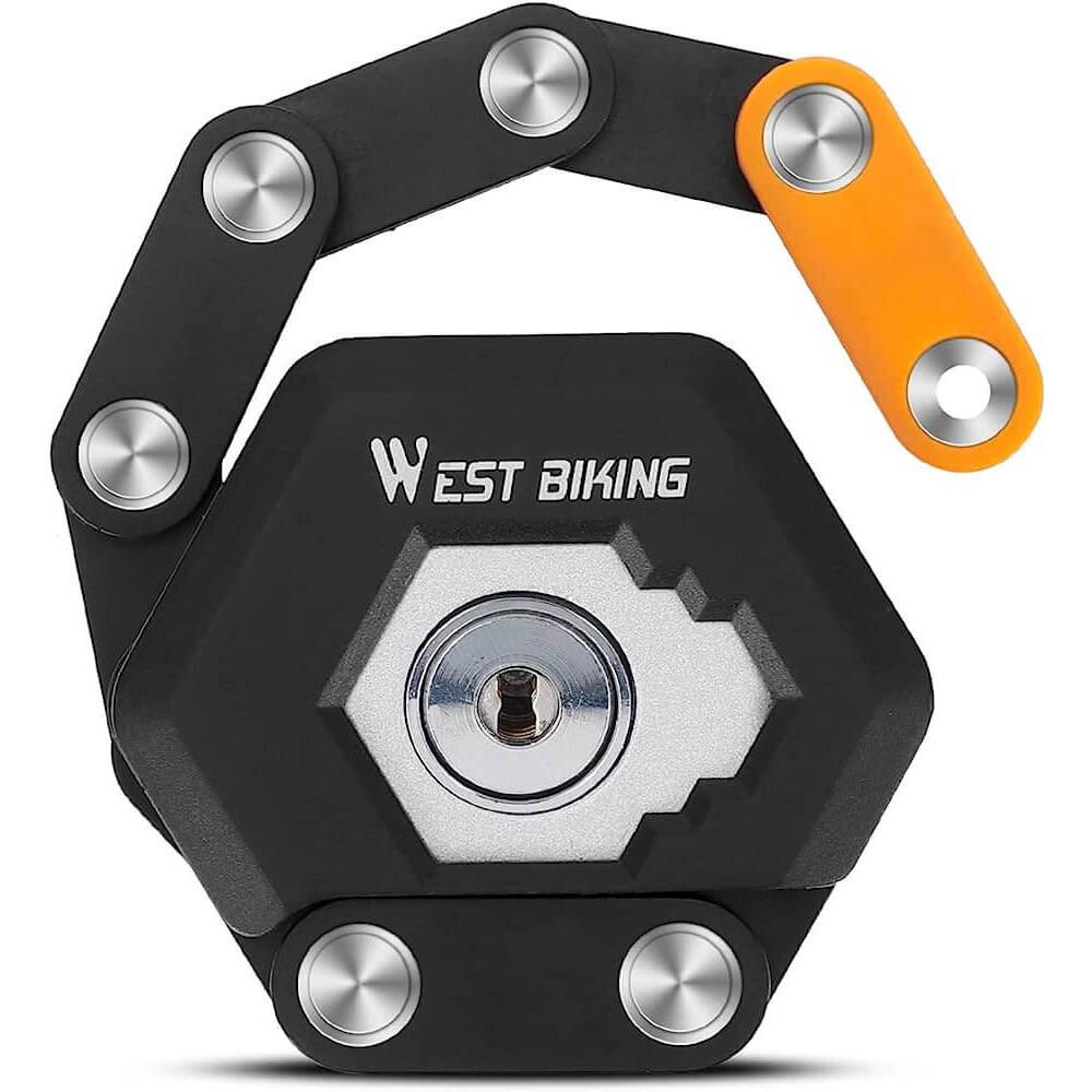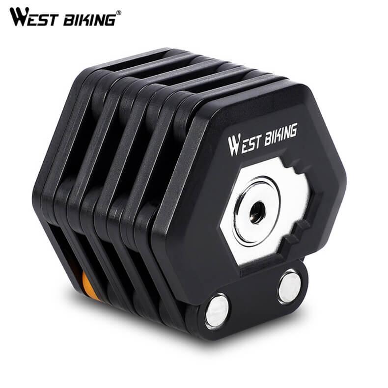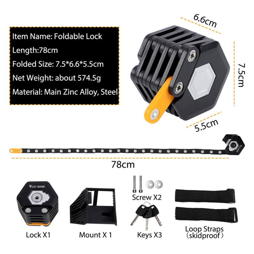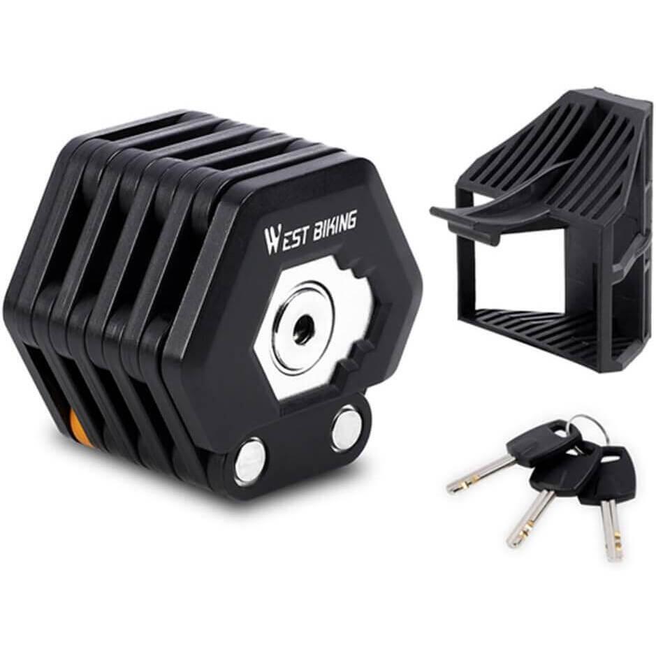 Antifurt mini cu cheie si suport prindere pentru biciclete de oras si electrice, motociclete, trotinete, scutere, sistem antifurt, anti-taiere si anti-gaurire, lungime 78 cm, pliabil, otel+zinc, West Biking, negru