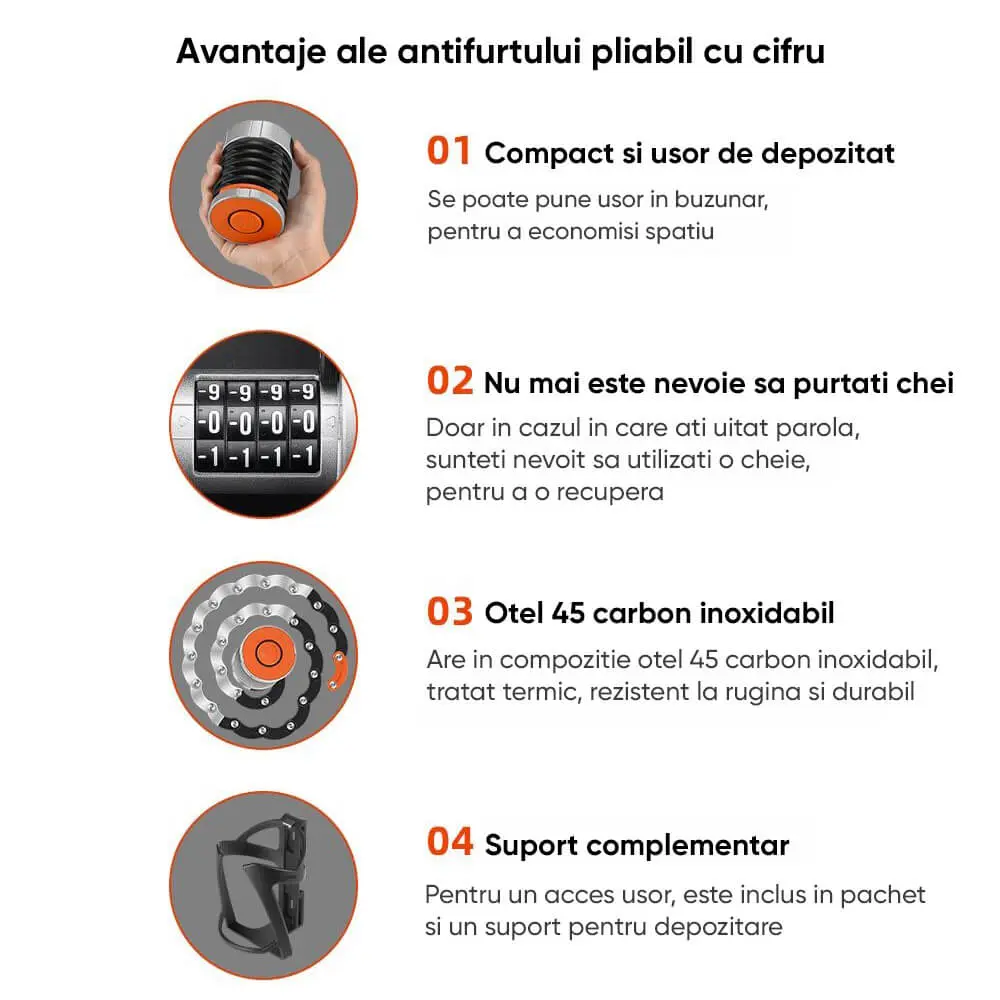 Antifurt pliabil mini pentru bicicleta, trotineta si scuter