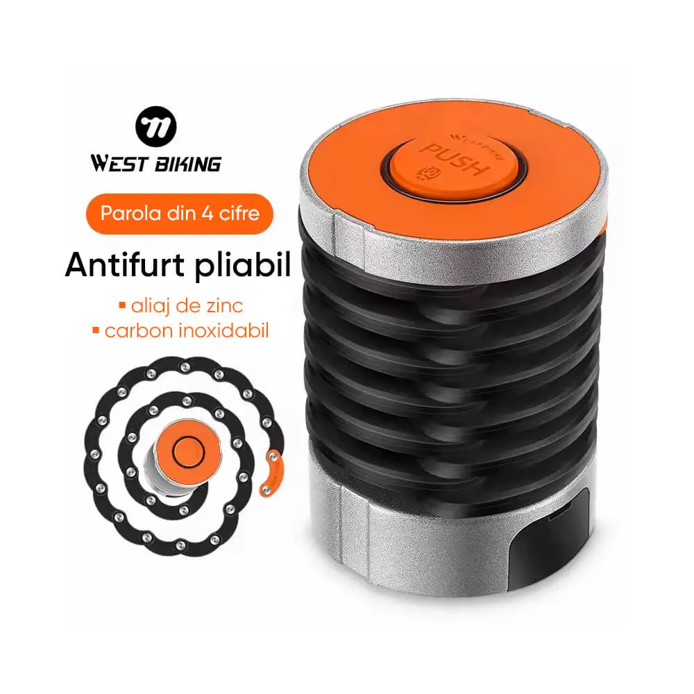 Antifurt pliabil mini pentru bicicleta, trotineta, scuter, 5 mm grosime otel 45 carbon inoxidabil, rezistent la taiere, inchidere cu cifru, West Biking, compact si durabil, lungime 88 cm