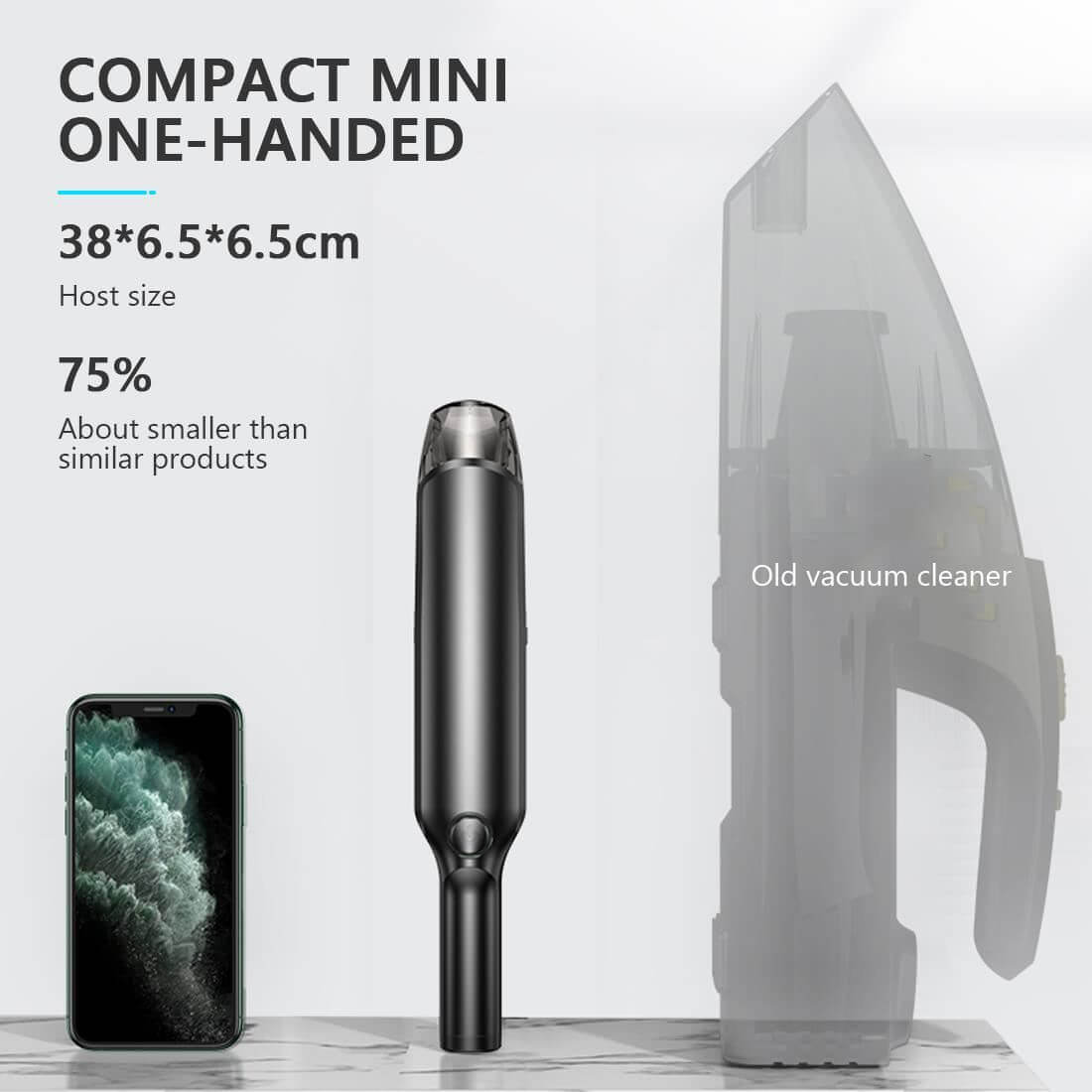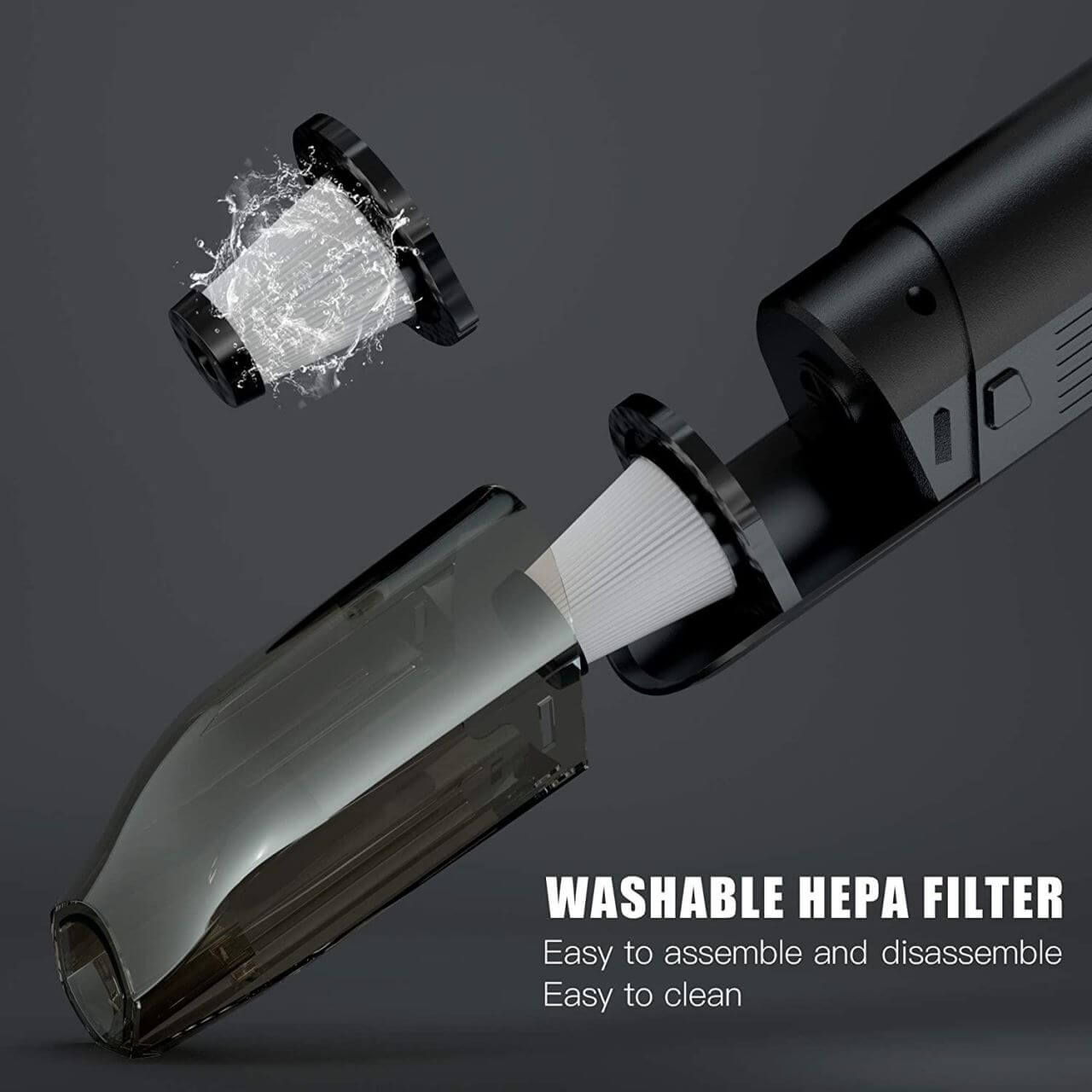 - Este un aspirator de mână wireless, cu un aspect premium, dotat cu un acumulator reîncărcabil de 6000mAh și un motor puternic de 80W, 2 viteze cu o putere de absorbție mare de 5000Pa și filtru HEPA lavabil.