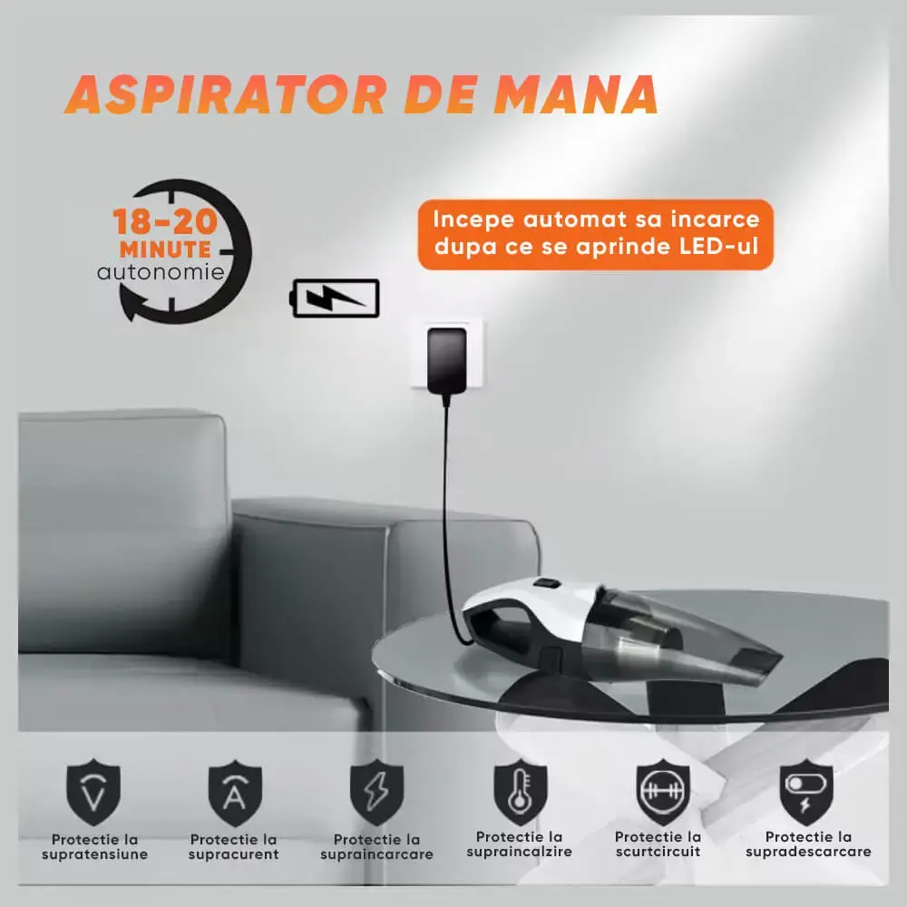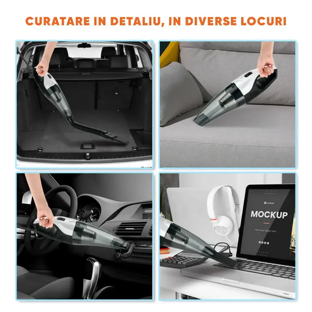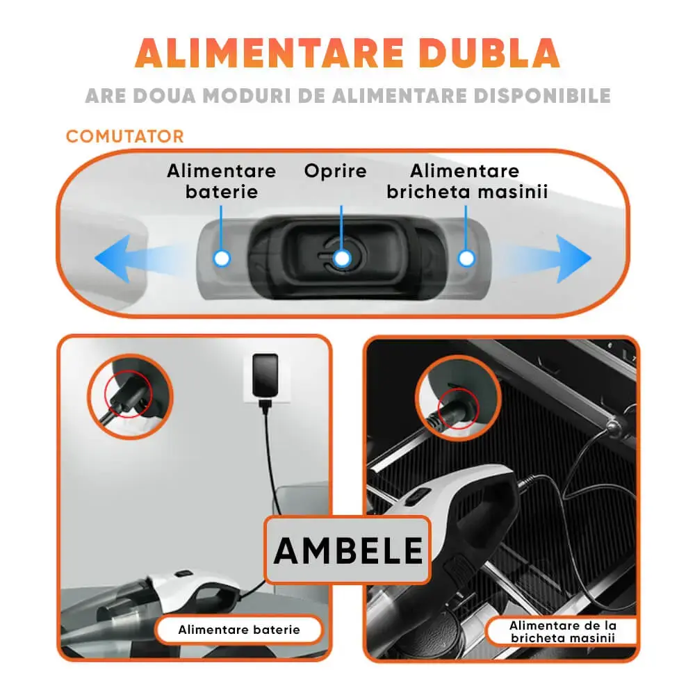 - Pentru utilizarea intr-un vehicul, puteti opta si pentru utilizarea aspiratorului alimentat de la bricheta acestuia (compatibilitate cu toate masinile, camioanele, furgonetele si SUV-urile echipate cu o bricheta).