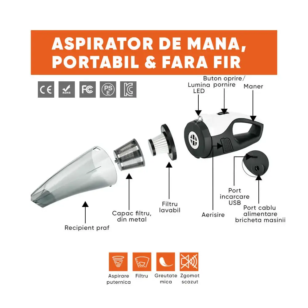- Aspiratorul portabil puternic de la Rollfast ofera o putere de aspirare de pana la 8000Pa, eliminand cu usurinta murdaria, resturile, parul de animale, pamantul, nisipul, lichidele si firimiturile din interiorul masinii, casei sau biroului dumneavoastra.
