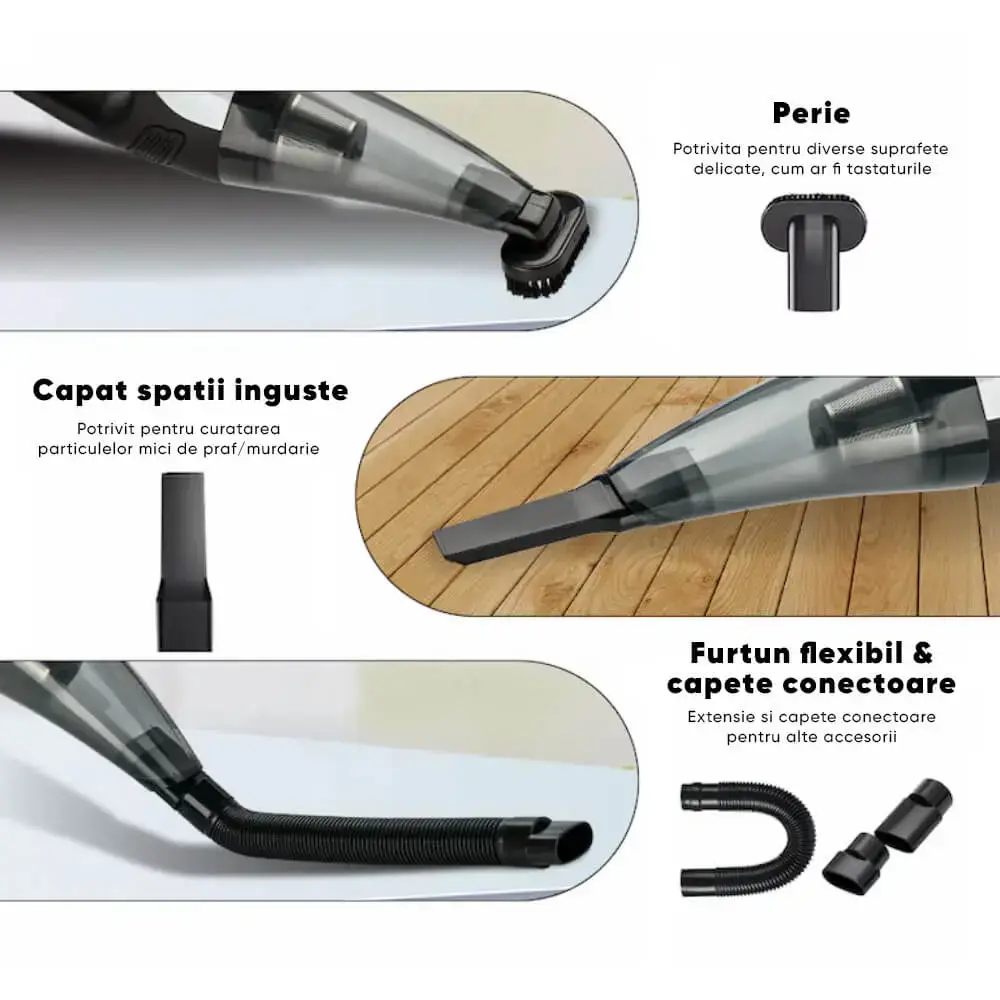 - Insotit de accesorii de curatare multiple, perfecte pentru curatarea fiecarui colt al vehiculului: o perie de praf, un capat spatii inguste, un furtun flexibil si doua capete conectoare.