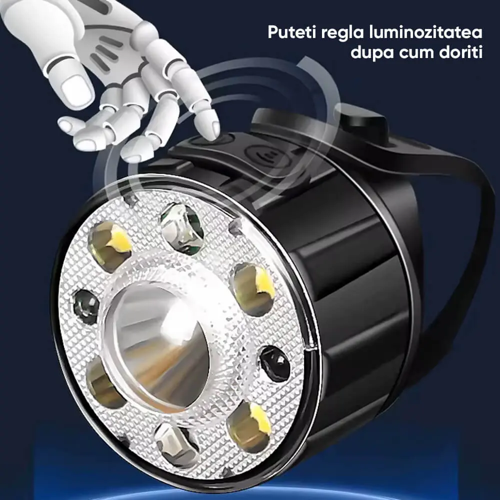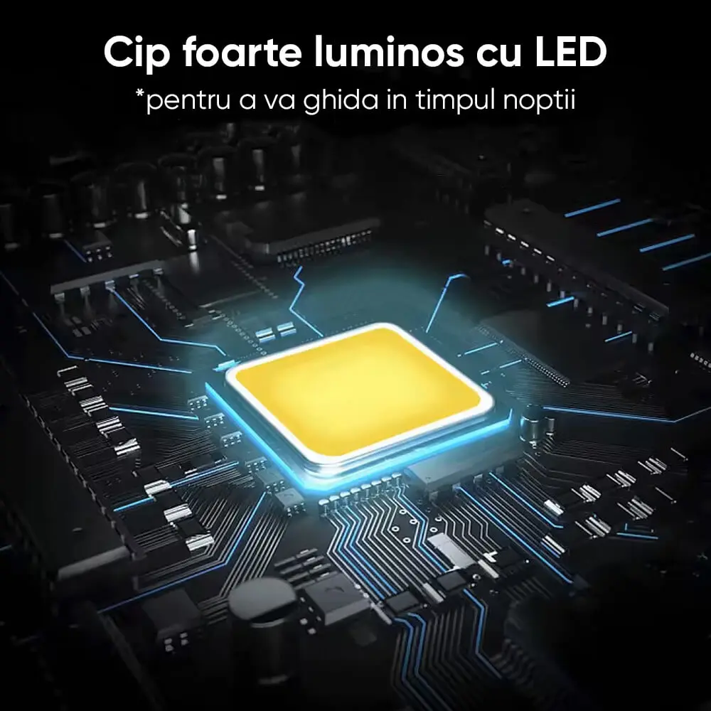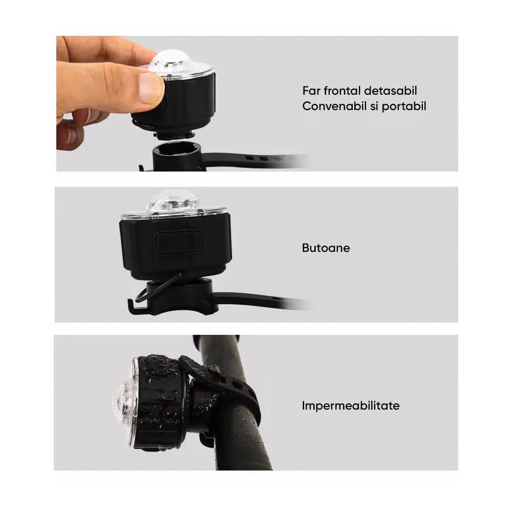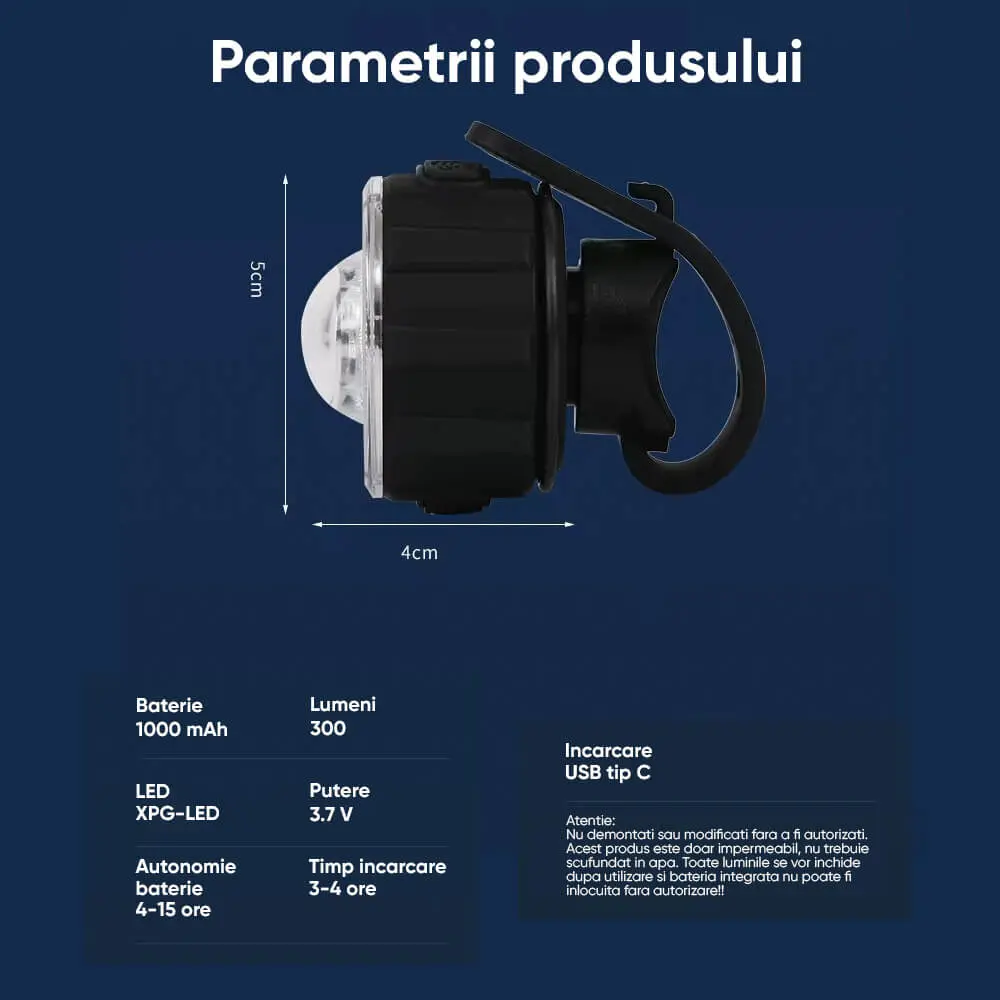 - Farul are un cip cu LED de 300 lumeni, foarte luminos, perfect pentru a va ghida in timpul noptii.