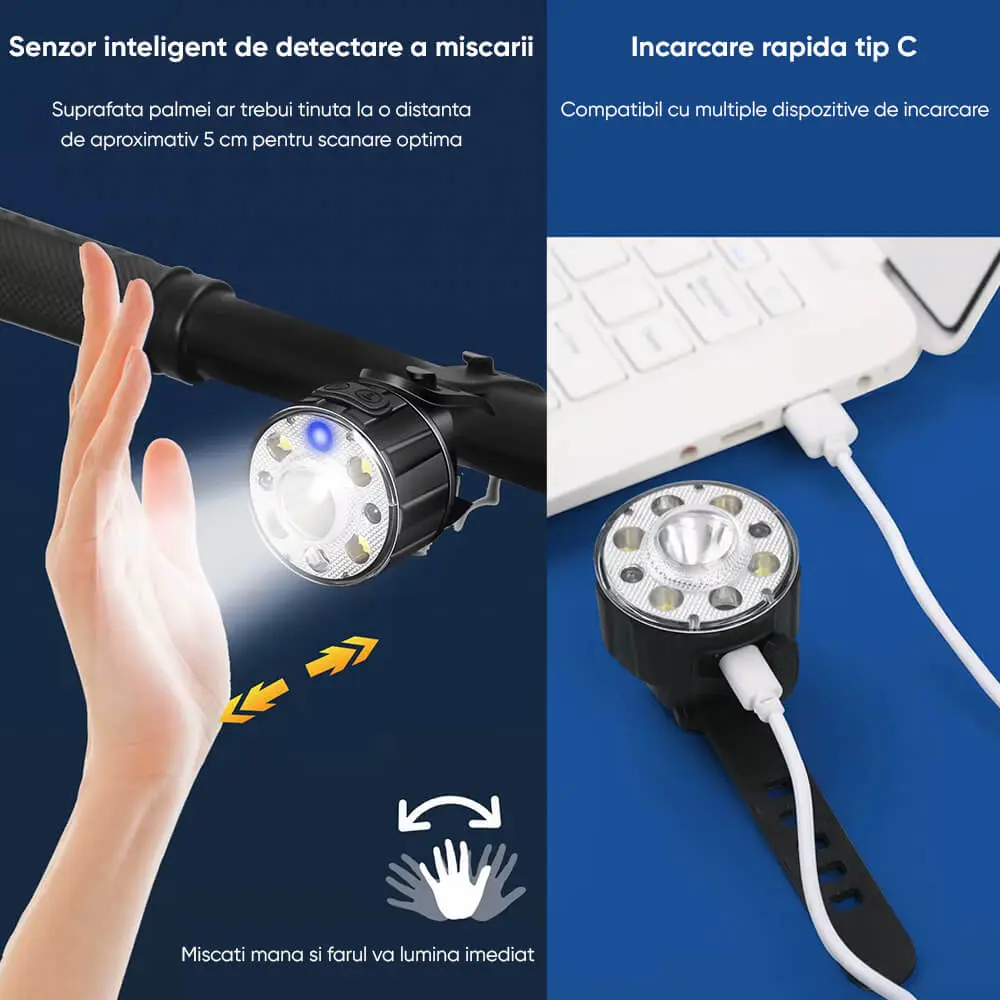 Far bicicleta fata, lanterna LED, senzor miscare, 300 lumeni, baterie 1000 mAh cu autonomie max 15 ore si incarcare USB, potrivire universala inclusiv trotineta, scuter, bicicleta electrica, e-bike, rezistent la apa, lumina bicicleta fata