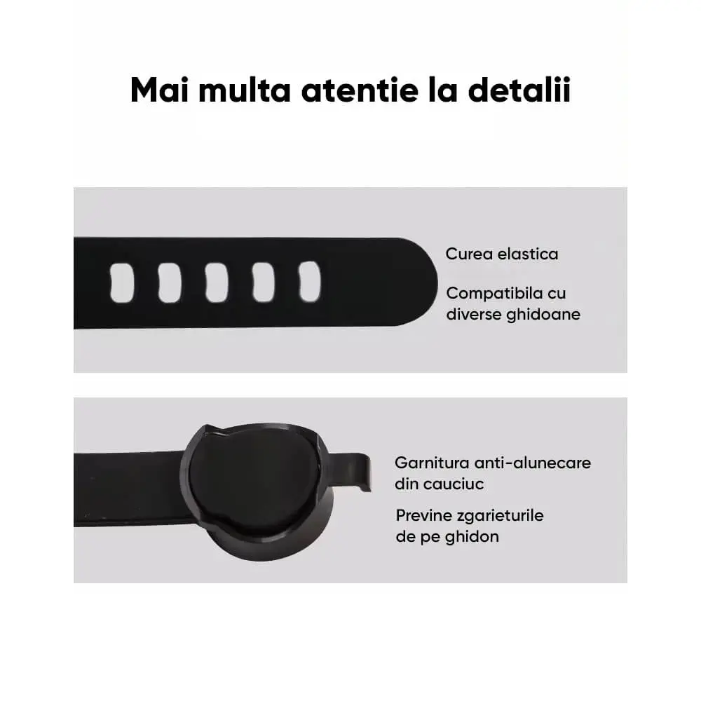 - Cureaua de cauciuc are si o garnitura anti-alunecare, pentru a preveni zgarieturile de pe ghidon.