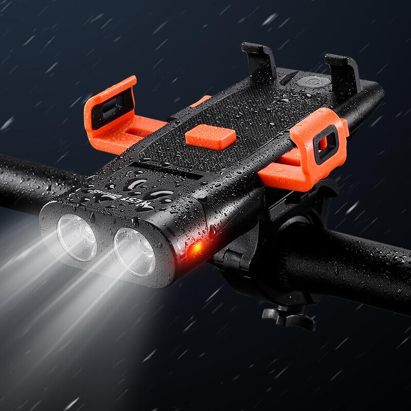 Far bicicleta multifunctional LED cu 5 functii, iluminare dubla 500 lumeni, 4 moduri de iluminare, vizibilitate 120 m, suport telefon, claxon, incarcare USB, West Biking, negru cu portocaliu