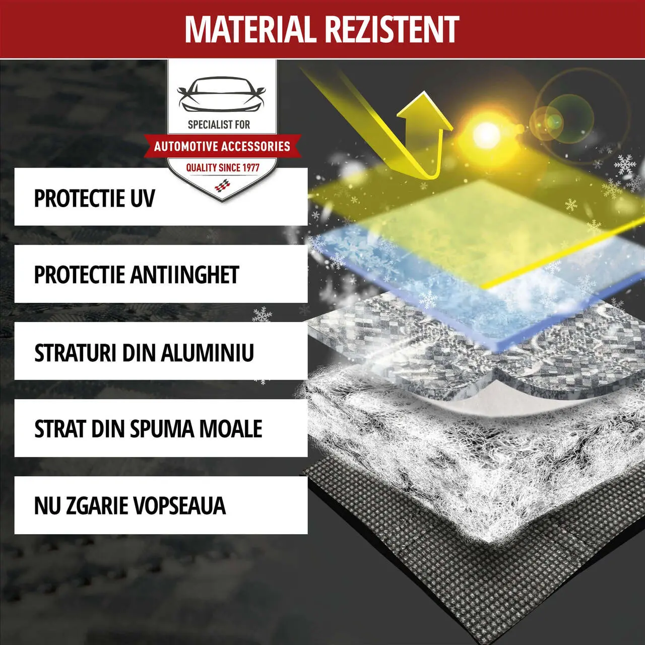 Husa pentru parbriz este All Season si se poate folosi atat pe timp de iarna cat si pe timp de vara, avand functie parasolar.