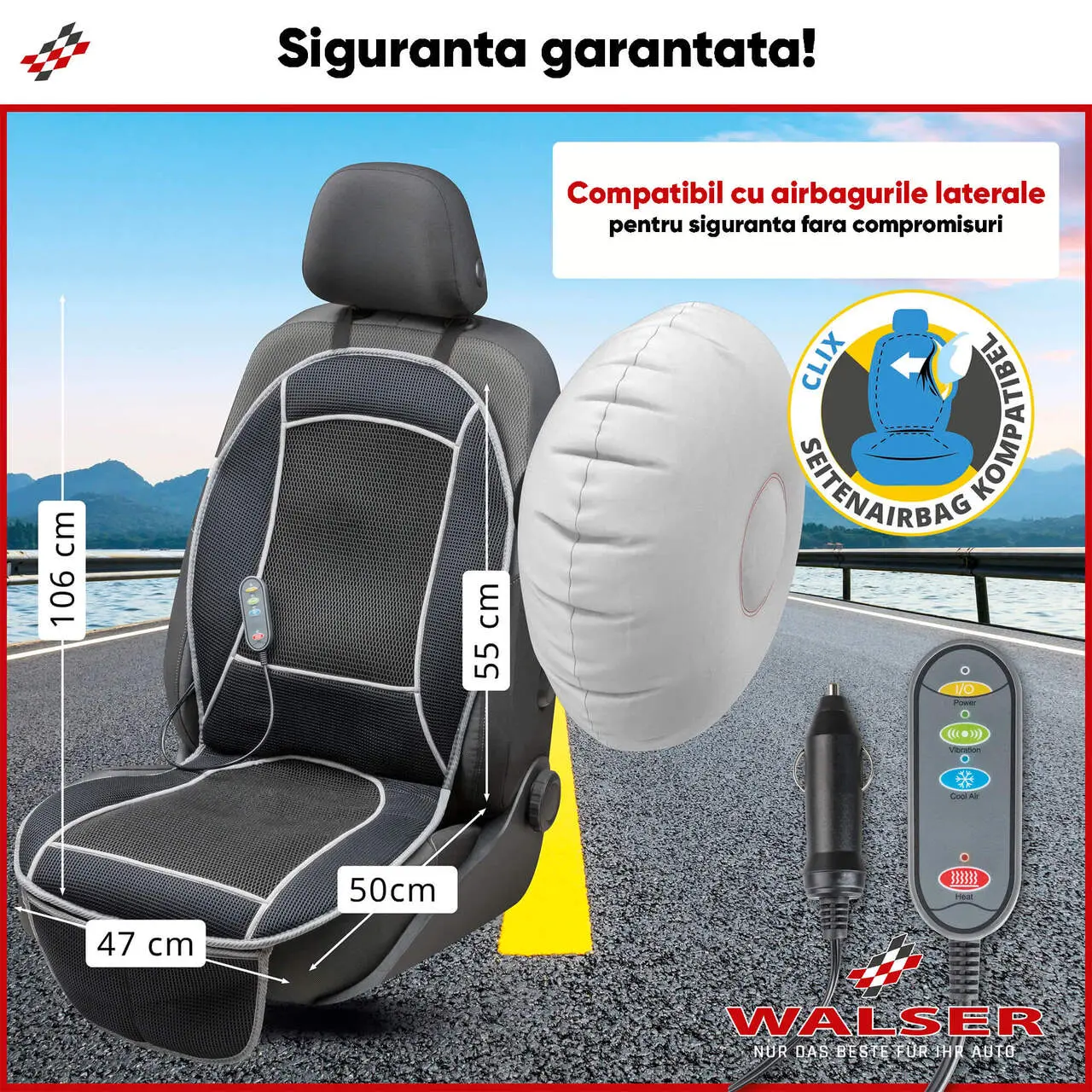 Husa de scaun auto Coolheat de la Walser cu functie de incalzire, racire si masaj este accesoriul ideal pentru a oferi un plus de confort si relaxare in timpul calatoriilor, in orice sezon. Aceasta husa este potrivita pentru majoritatea scaunelor auto, inclusiv cele cu airbag lateral.