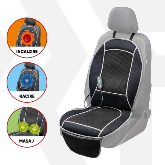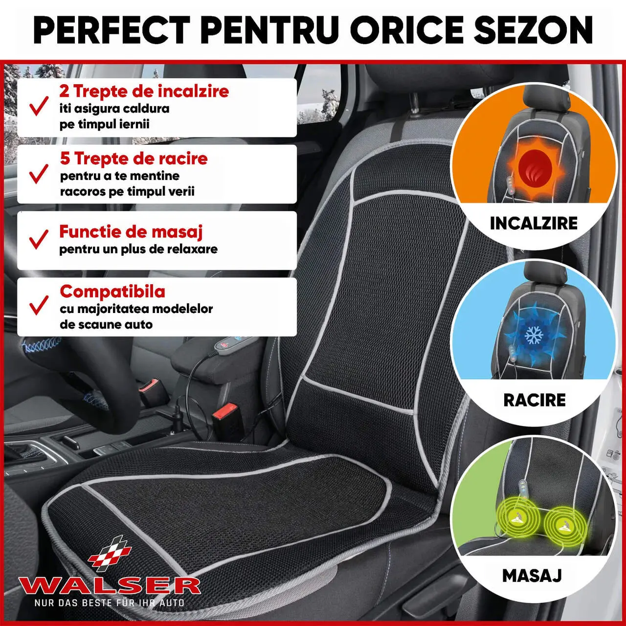 Husa scaun auto, 3 functii, incalzire, racire si masaj, alimentare 12V, negru, Walser