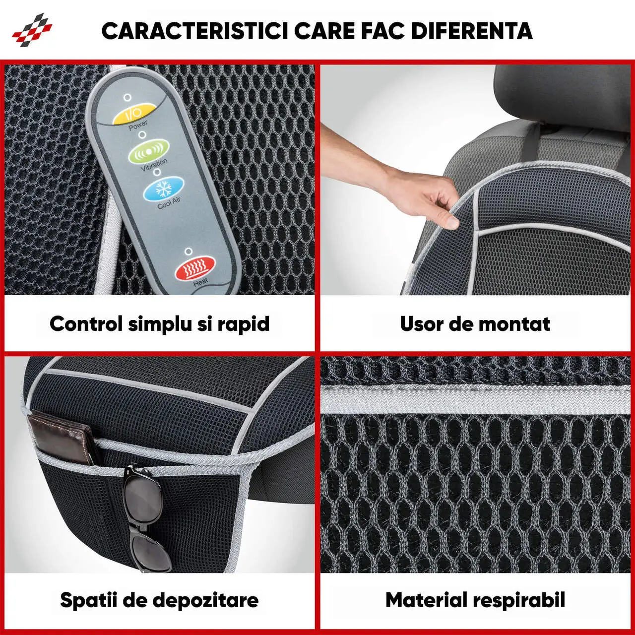 - Functii multiple: 2 trepte de incalzire, 5 trepte de racire si functia de masaj, toate controlate cu ajutorul telecomenzii integrate. Functia de masaj ofera o vibratie usoara in zona lombara, reducand tensiunea musculara si fiind ideala pentru calatorii lungi.