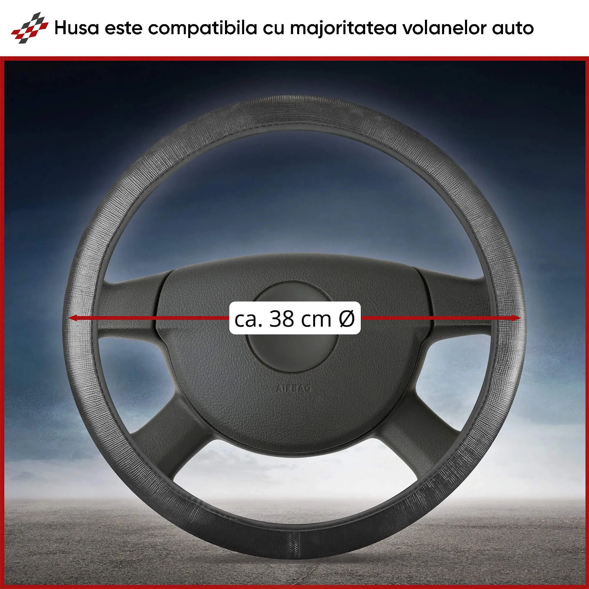 - Potrivita pentru volan cu un diametru de aproximativ 38 cm, iar materialul flexibil asigura