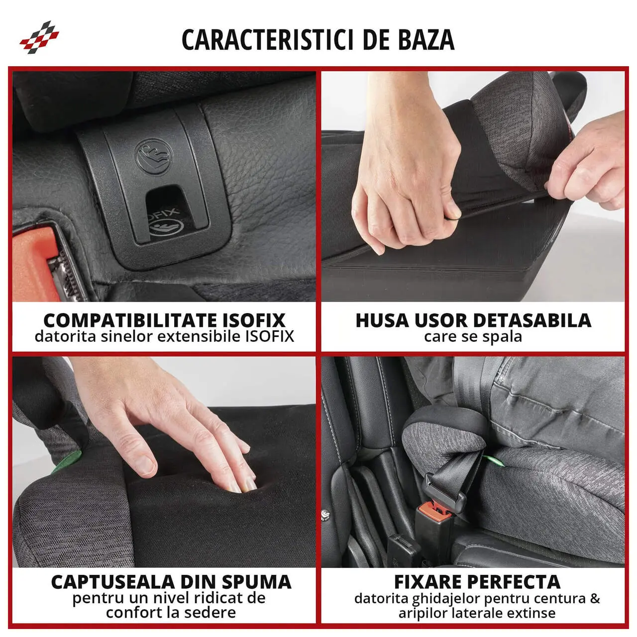 - Scaunul inaltator universal se potriveste oricarui vehicul cu centura de siguranta in trei puncte.