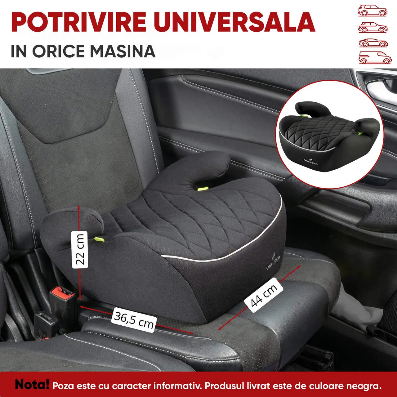 - Scaunul inaltator universal se potriveste oricarui vehicul cu centura de siguranta in trei puncte.