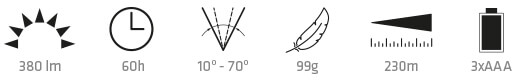 Oferă un impresionant număr de 380 de lumeni cu doar 3 x baterii AAA și va dura până la 60 de ore la nivel scăzut.