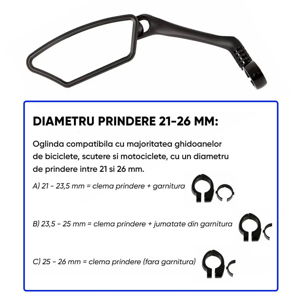 - Compatibila cu majoritatea ghidoanelor de biciclete, scutere si motociclete, cu un diametru de prindere intre 21 si 26 mm.