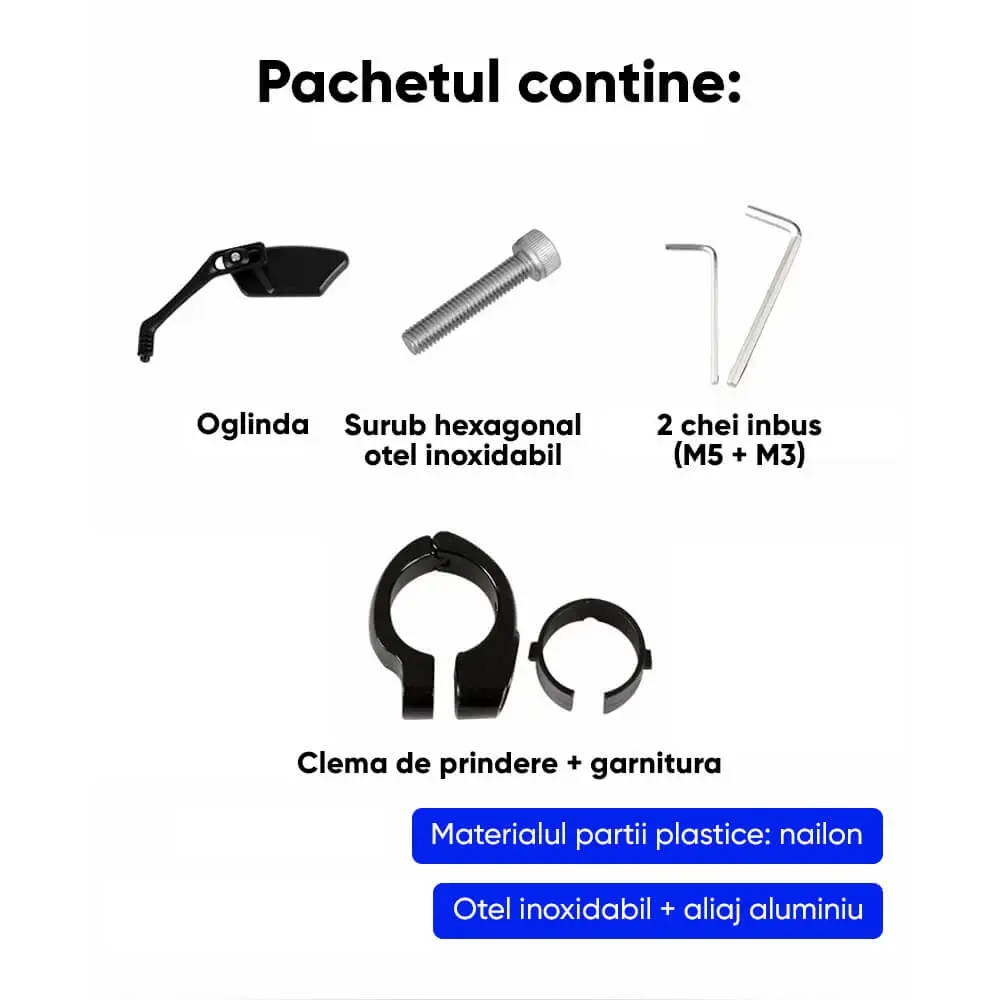 - Oglinda se monteaza rapid, in pachet este clema de prindere cu cheia de montare si nu aveti nevoie de alte unelte sau de adeziv.