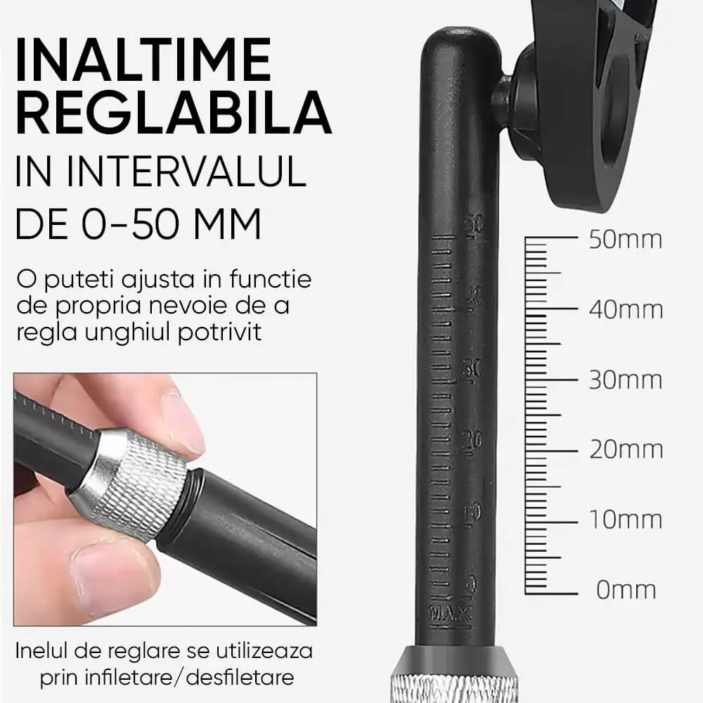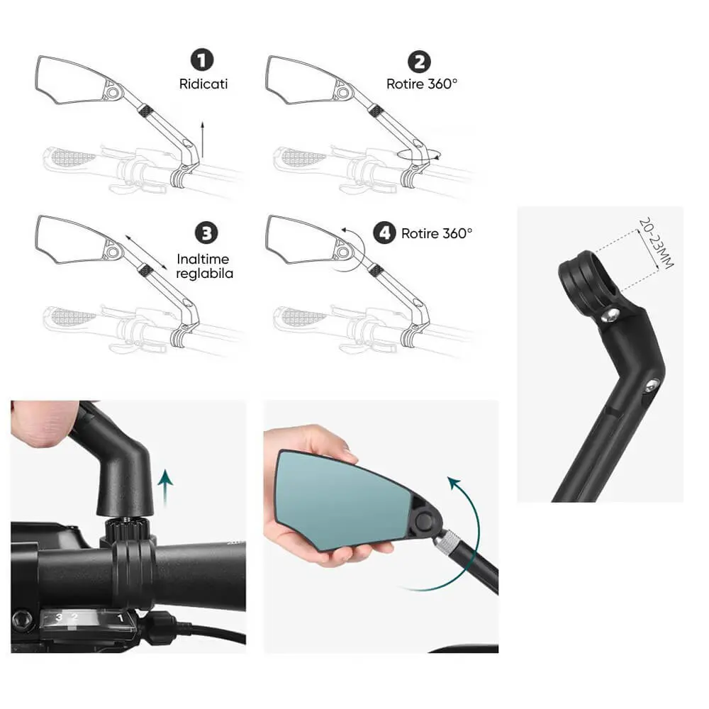 - Cu ajutorul suportului inclus, puteti ajusta inaltimea oglinzii astfel incat sa se potriveasca perfect pozitiei dumneavoastra de pedalat, asigurand confort si eficienta maxima.