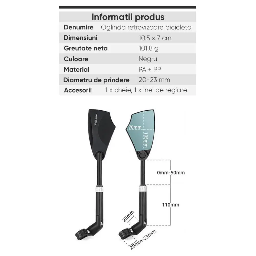 - Vizibilitatea si siguranta pe drum vor fi imbunatatite cu oglinda de inalta calitate de la West Biking, ideala pentru biciclete, scutere si motociclete.