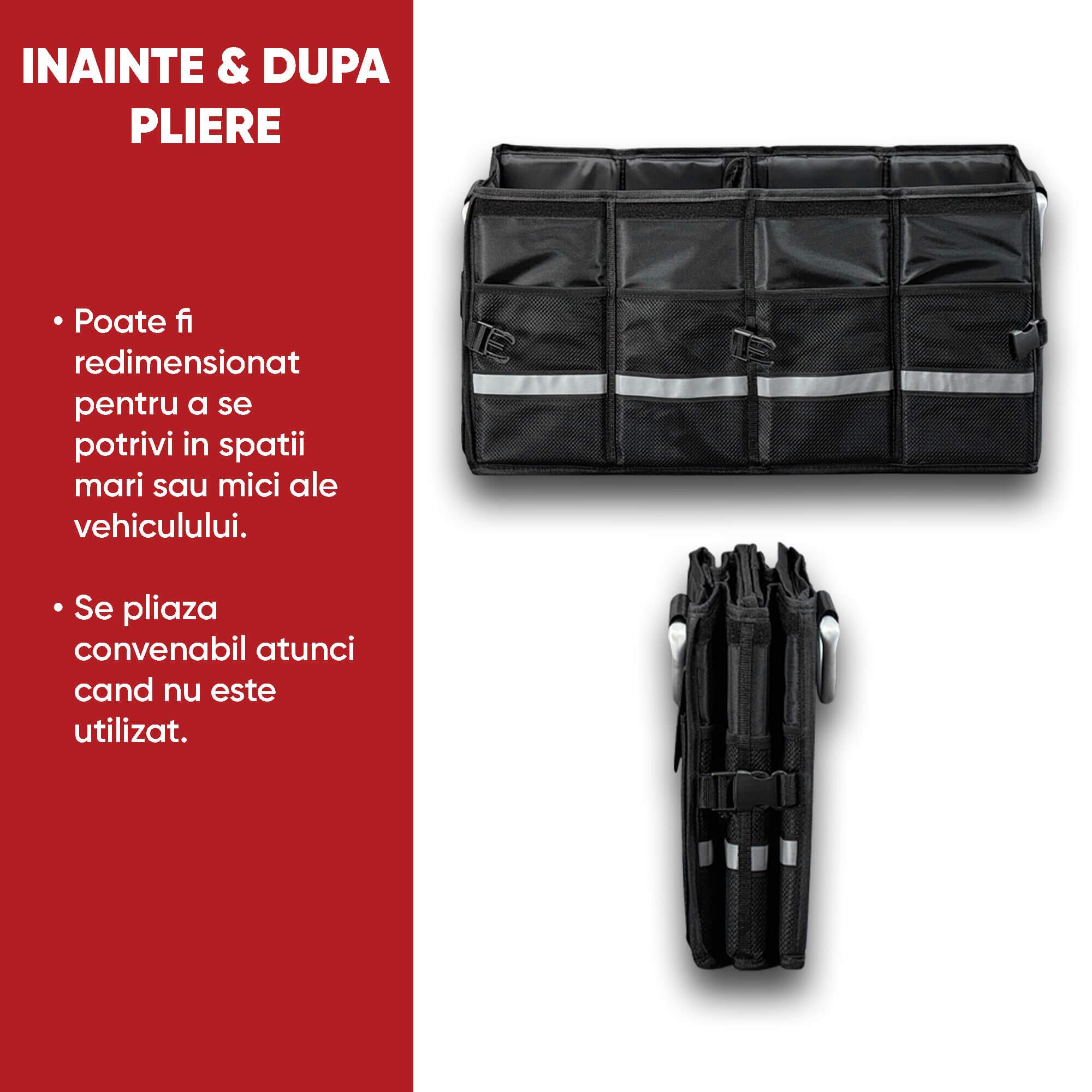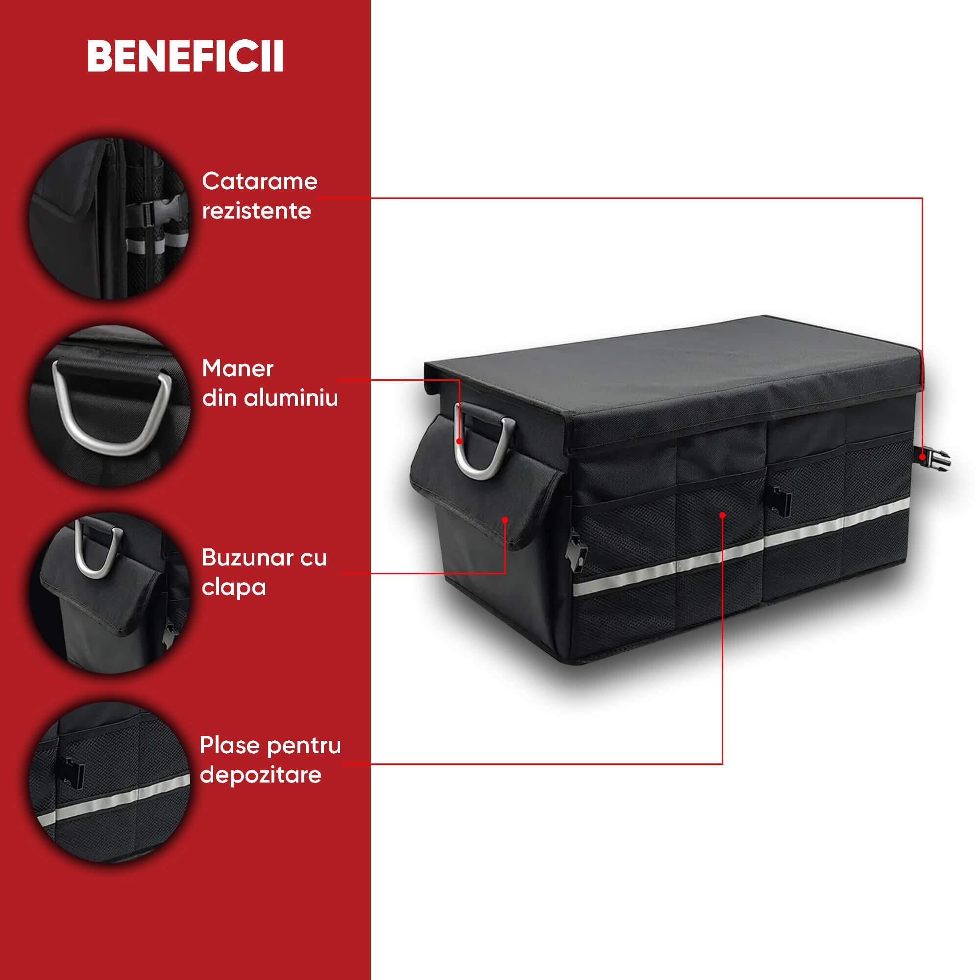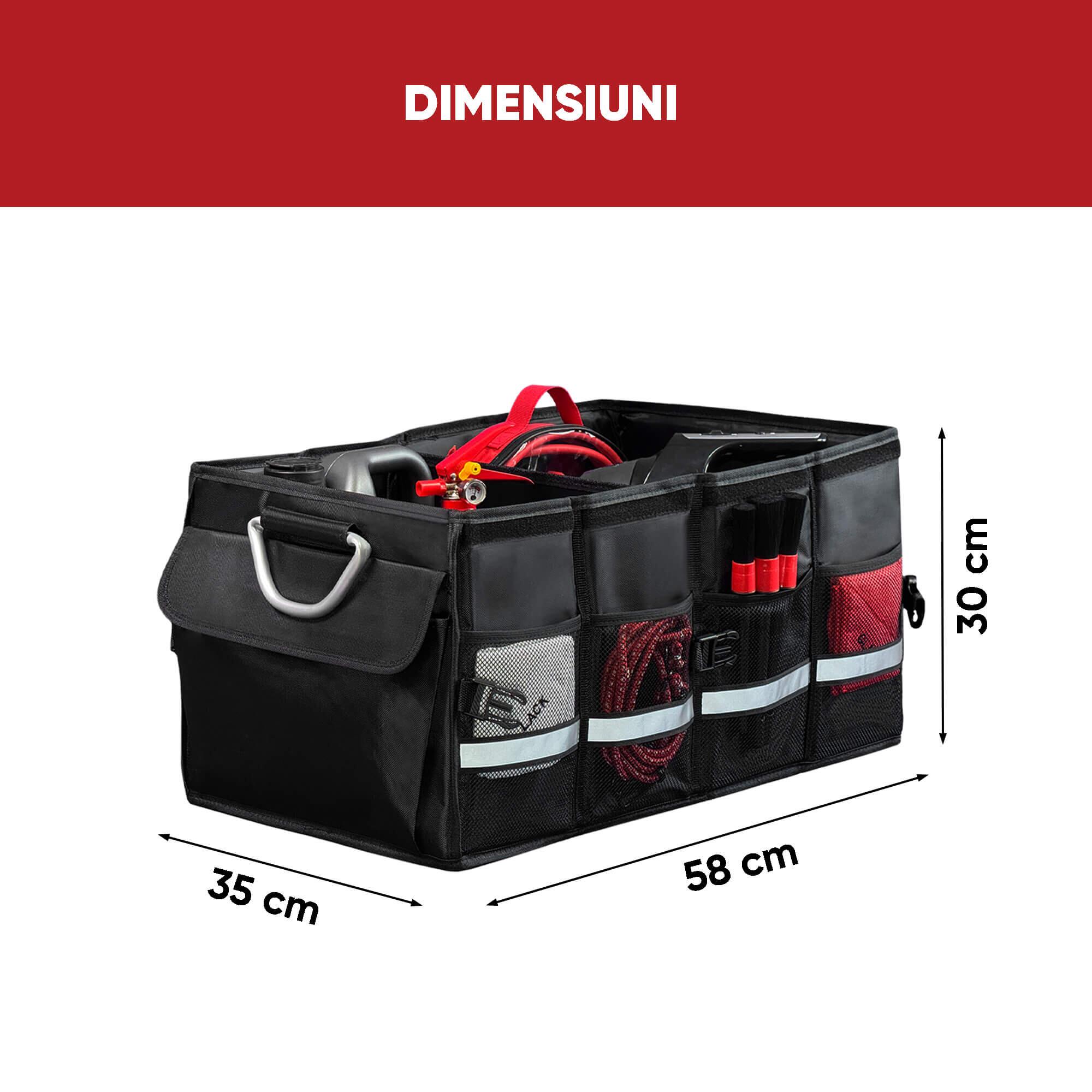 Organizator portbagaj auto Premium, 58x35x30 cm, cu manere din aluminiu, capac si fixare velcro, pliabil, impermeabil, negru