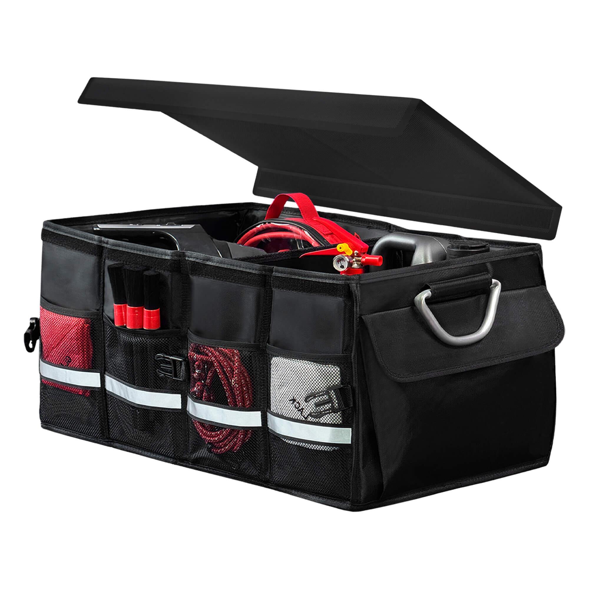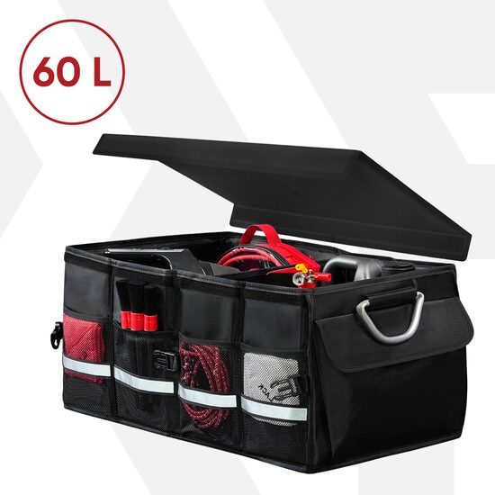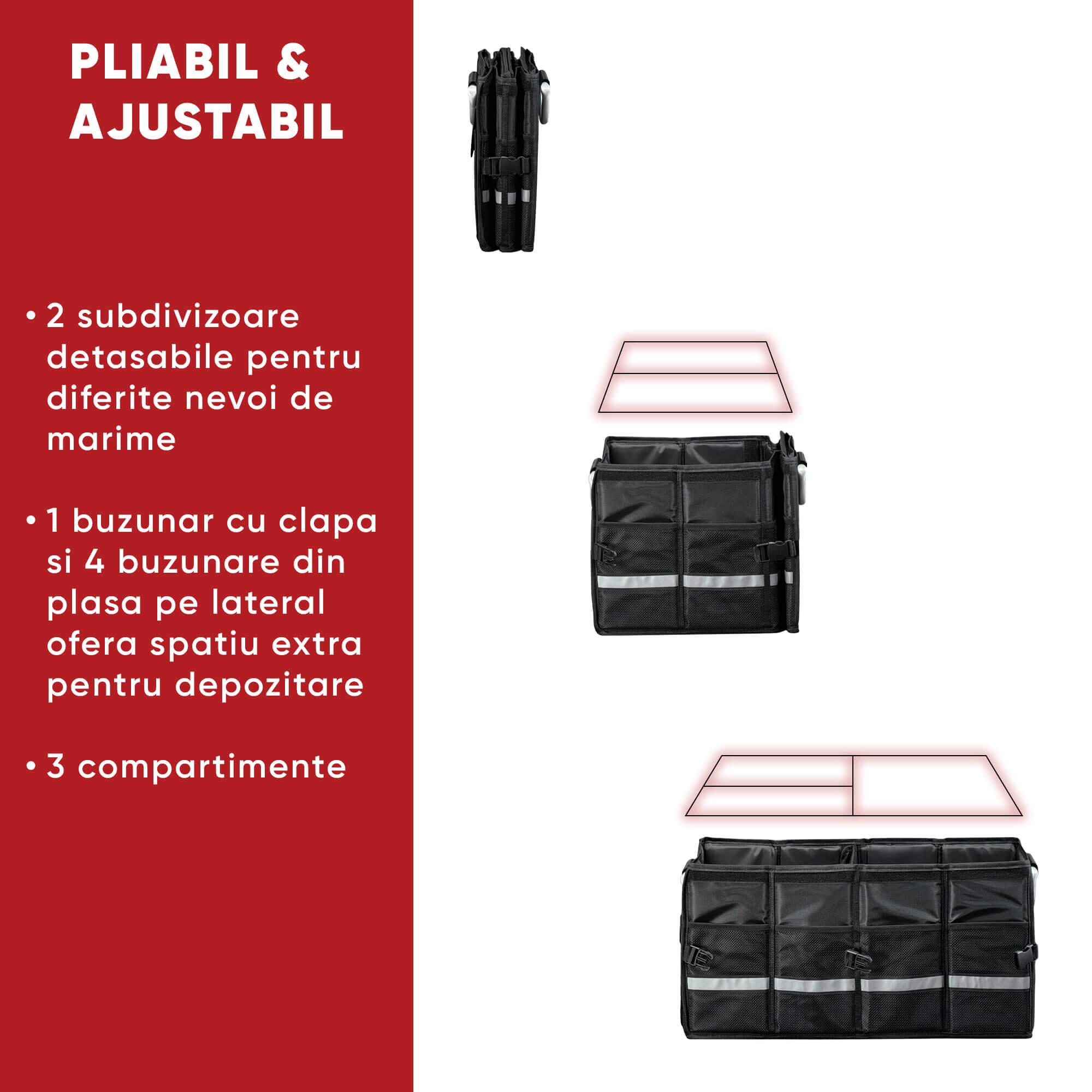 Organizator portbagaj auto Premium, 58x35x30 cm, cu manere din aluminiu, capac si fixare velcro, pliabil, impermeabil, negru