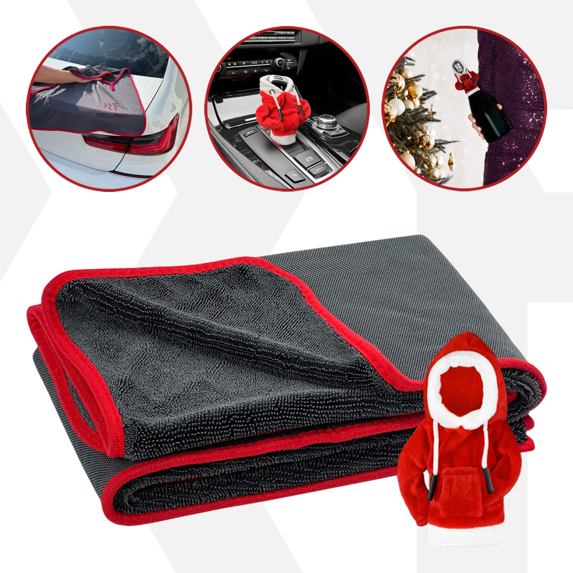 Acest pachet cadou pentru barbati combina un prosop auto de calitate, ideal pentru ingrijirea masinii, cu un accesoriu decorativ original, aducand functionalitate si un plus de stil interiorului oricarui autoturism. Pachetul contine un prosop premium XXL pentru uscare auto din microfibra Twisted Loop, si o husa pentru schimbatorul de viteze tip hanorac cu gluga, model Craciun.