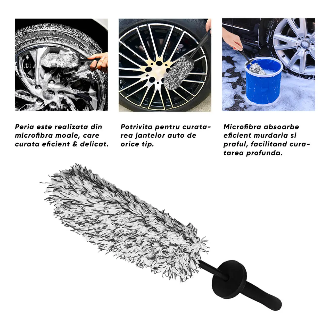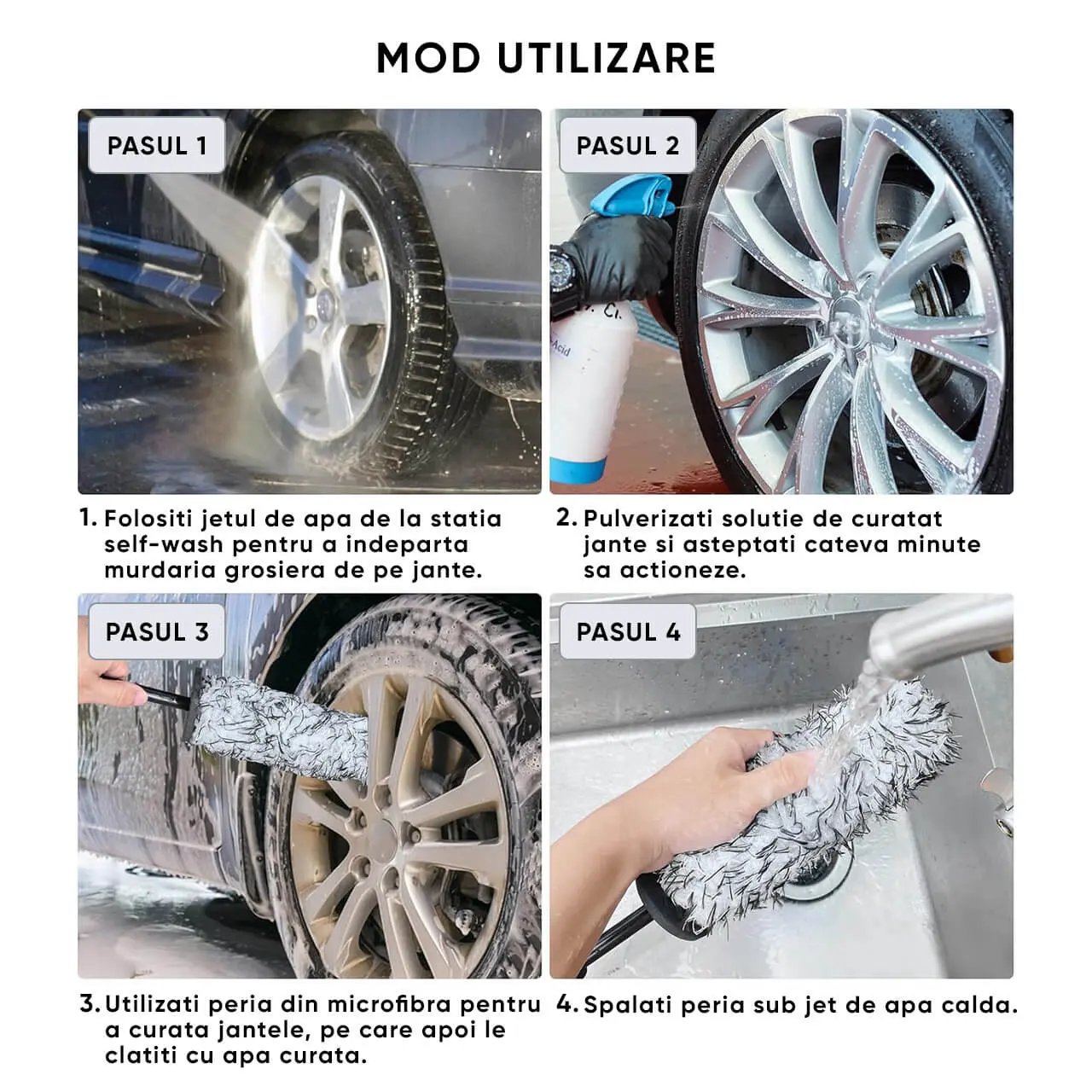 - Utilizeaza peria din microfibra pentru a freca usor jantele, concentrandu-te pe zonele murdare.