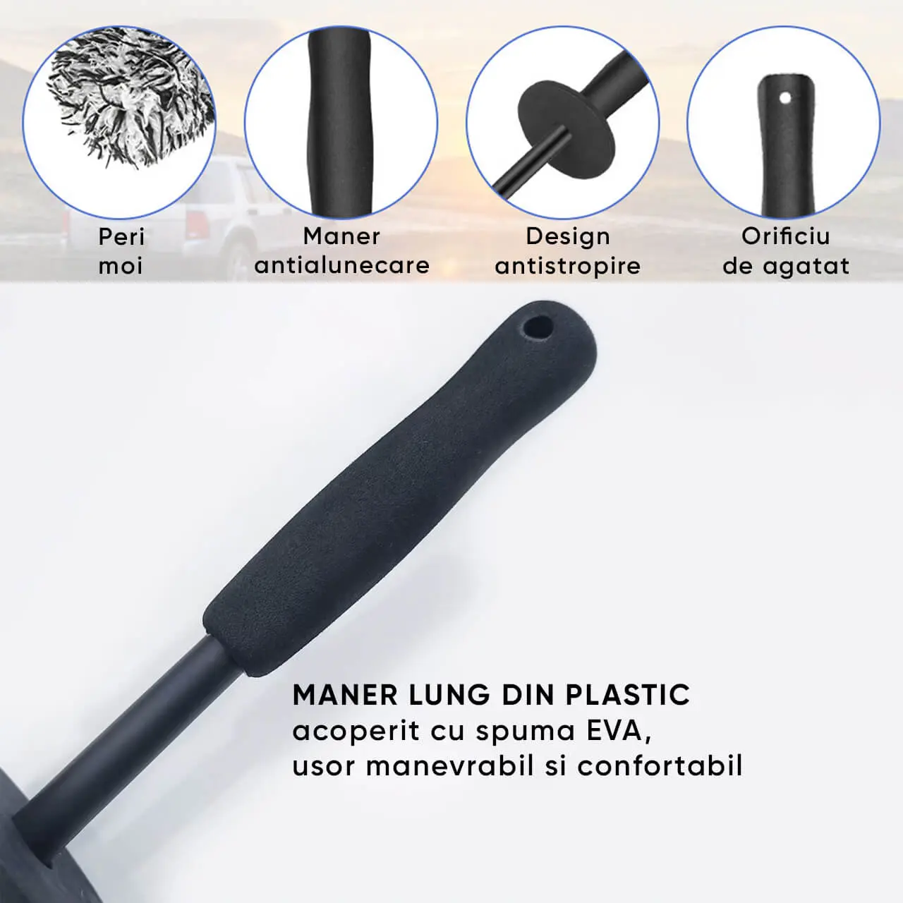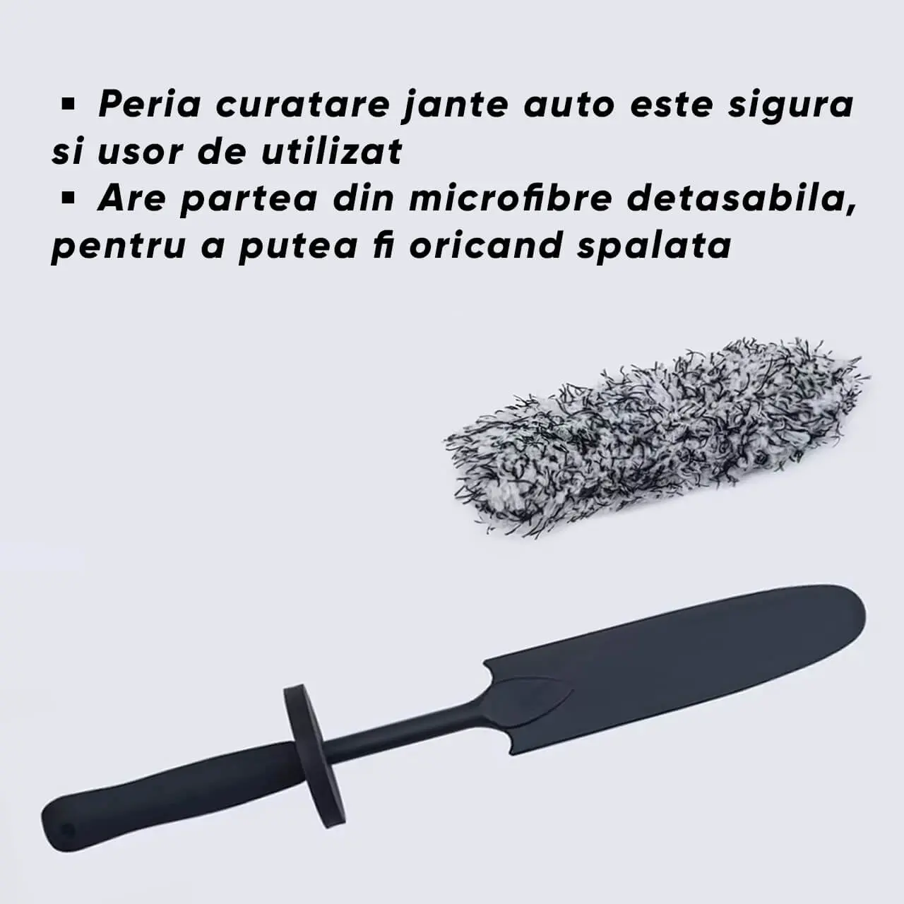 - Designul ergonomic al periei permite o manevrare usoara si confortabila, permitandu-ti sa ajungi cu usurinta in zonele mai greu accesibile ale jantelor.