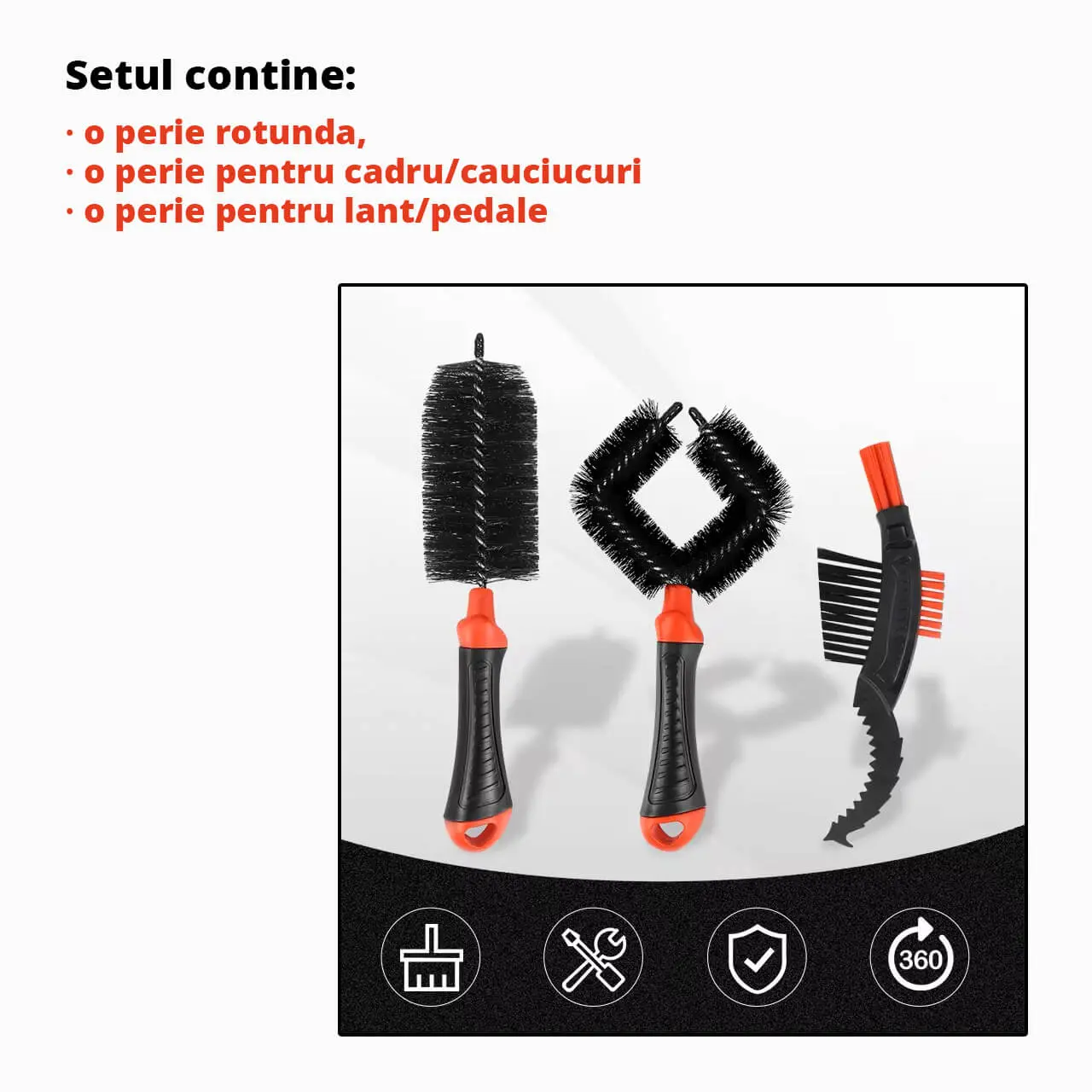 - Setul contine o perie rotunda, o perie pentru cadru/cauciucuri si o perie pentru lant/pedale.