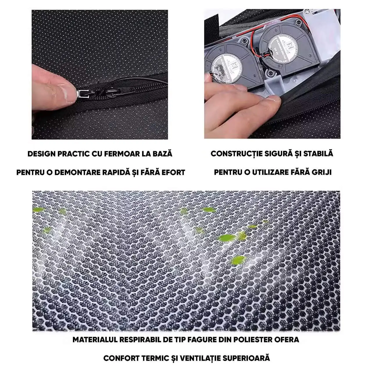 - Actioneaza ca un strat protectiv pentru racorire si aerisire între tine si tapiteria din piele sau vinil a scaunului tau auto.