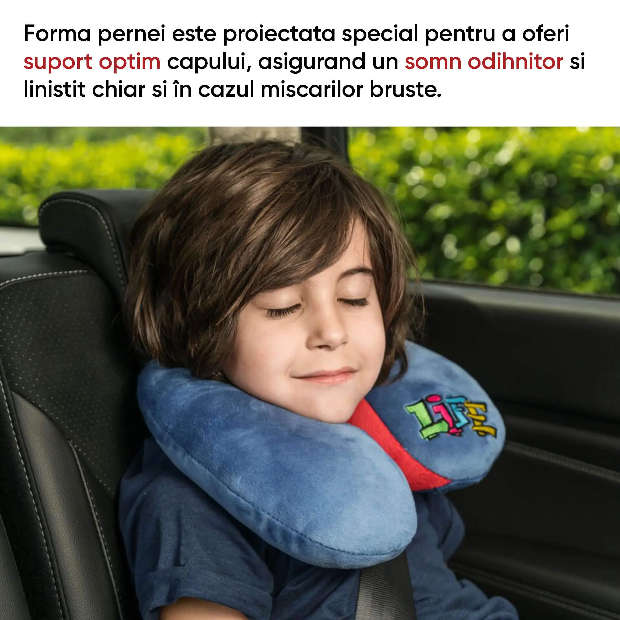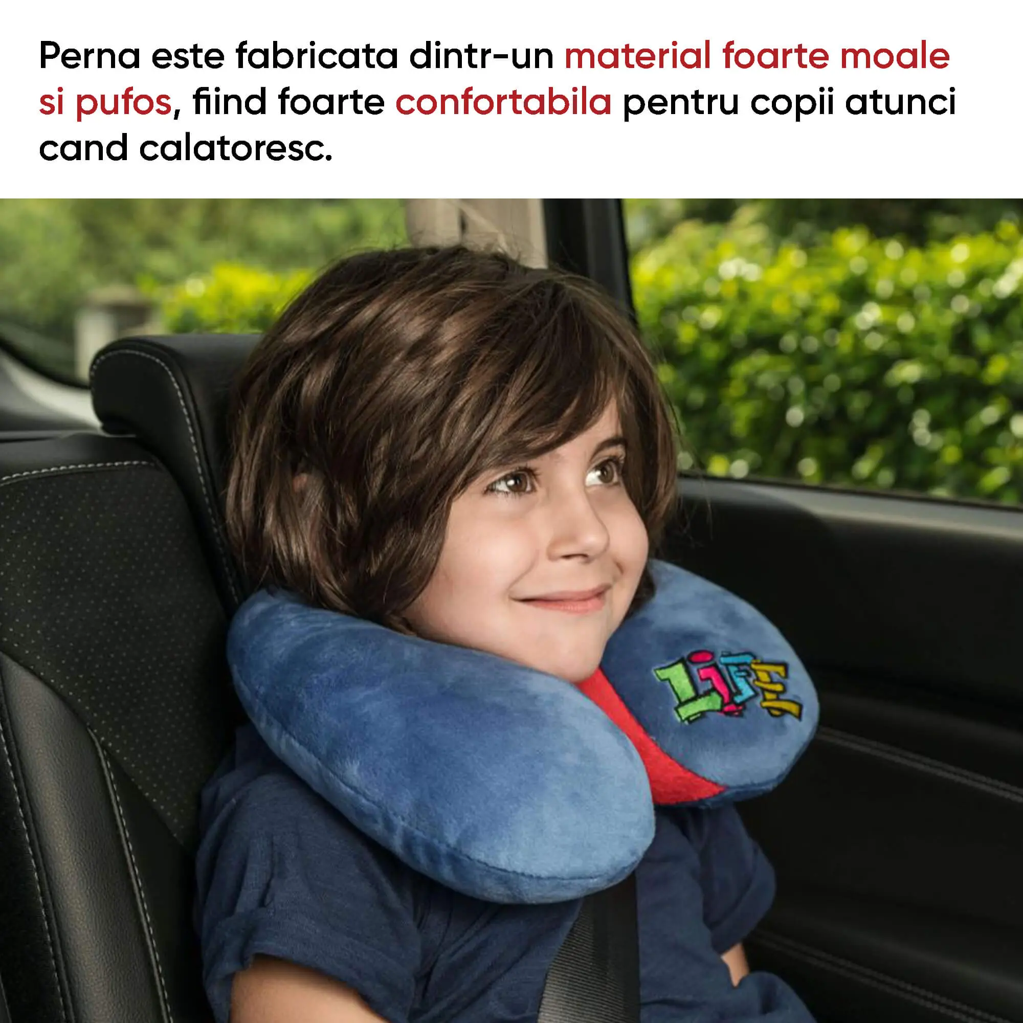 - Este fabricata dintr-un material foarte moale si pufos, fiind foarte confortabila pentru copii atunci cand calatoresc cu masina, avionul, autocarul, etc.