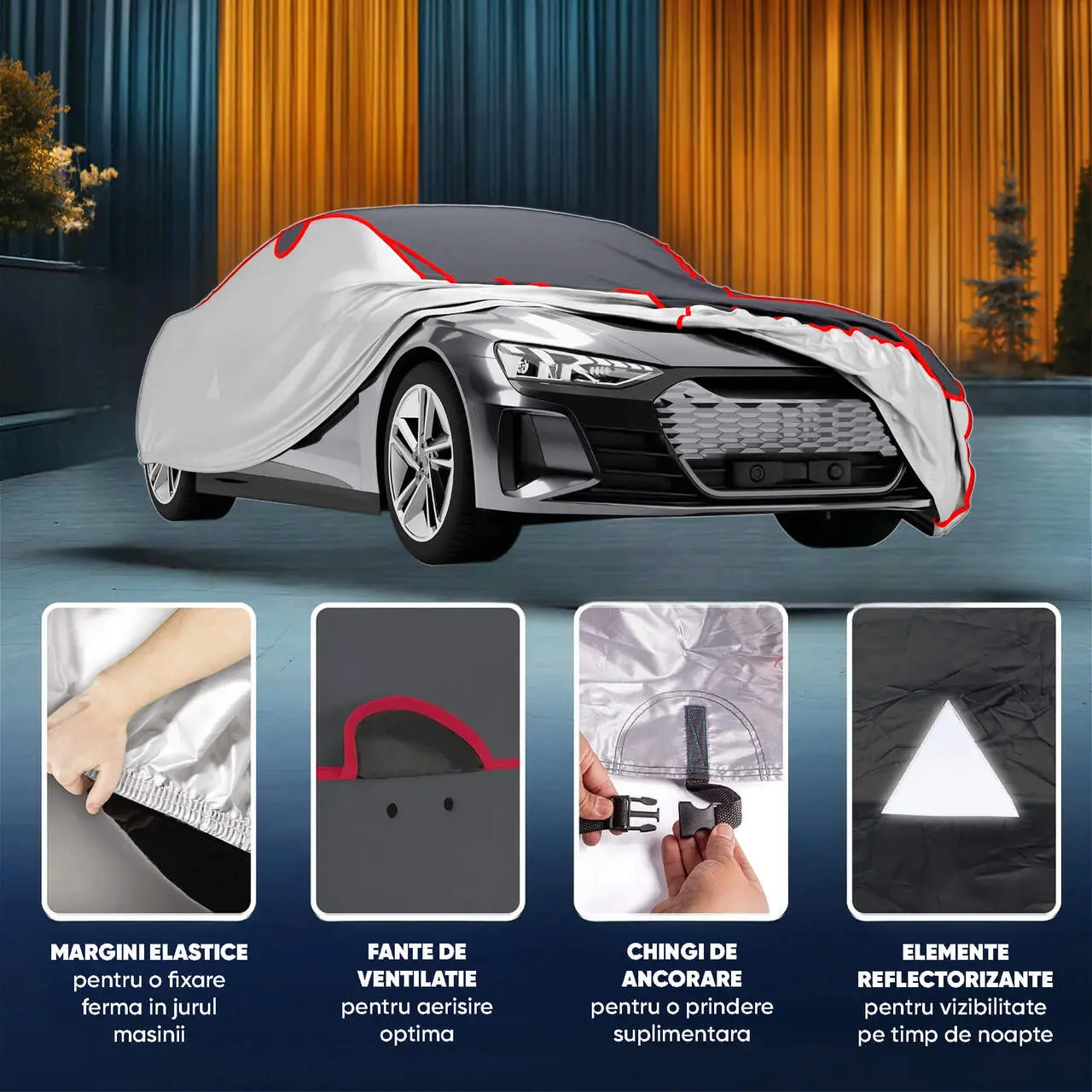 - Elasticul de fixare la baza prelatei ofera o prindere ferma in jurul masinii, prevenind ridicarea prelatei de catre vant.