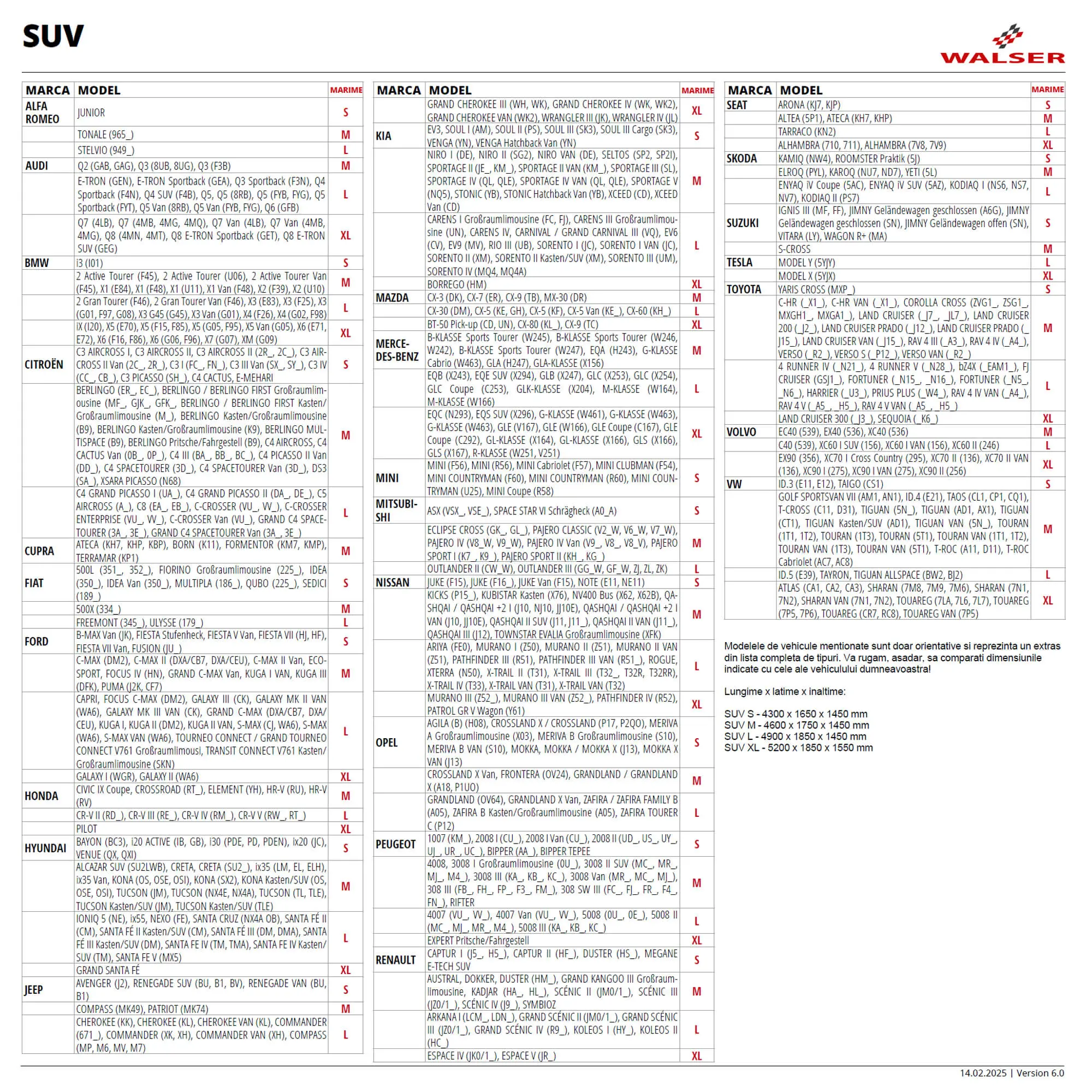 Alege marimea potrivita pentru modelul tau de masina cu ajutorul tabelului de mai jos: