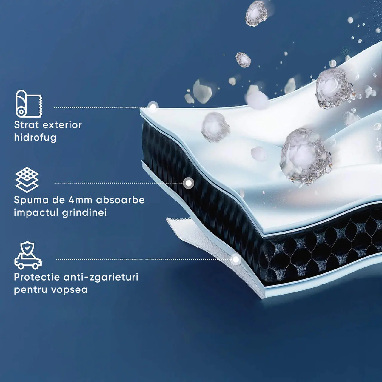 - Stratul din spuma de neopren de 4 mm absoarbe socurile si reduce impactul provocat de grindina