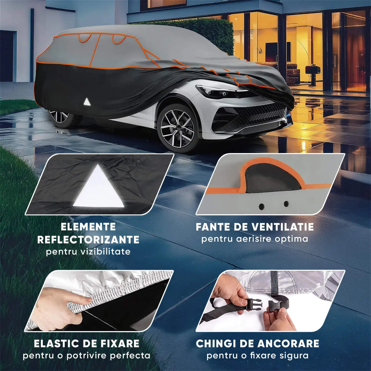 - Elasticul de fixare la baza prelatei ofera o prindere ferma in jurul masinii, prevenind ridicarea prelatei de catre vant.