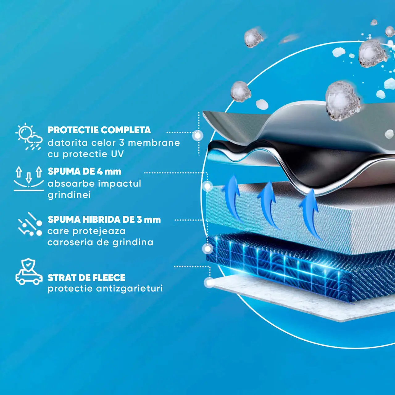 - Stratul din spuma de neopren de 4 mm absoarbe socurile si reduce impactul provocat de grindina