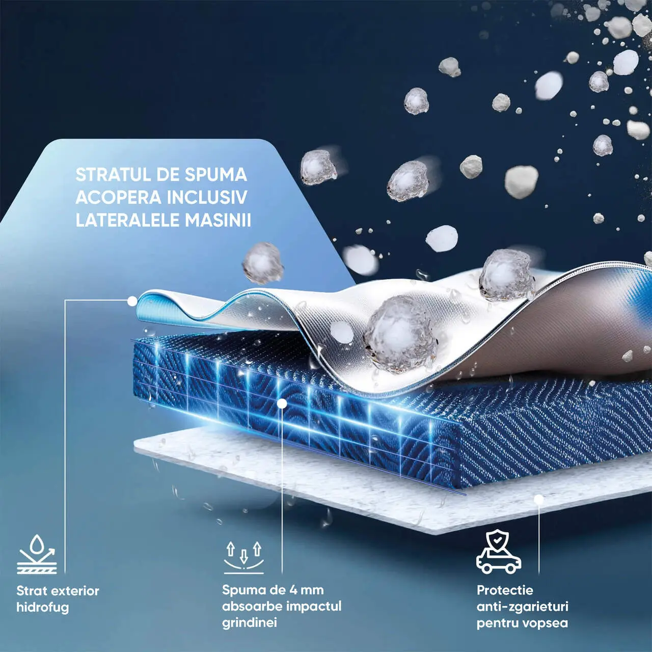 - Stratul din spuma de neopren de 4 mm absoarbe socurile si reduce impactul provocat de grindina