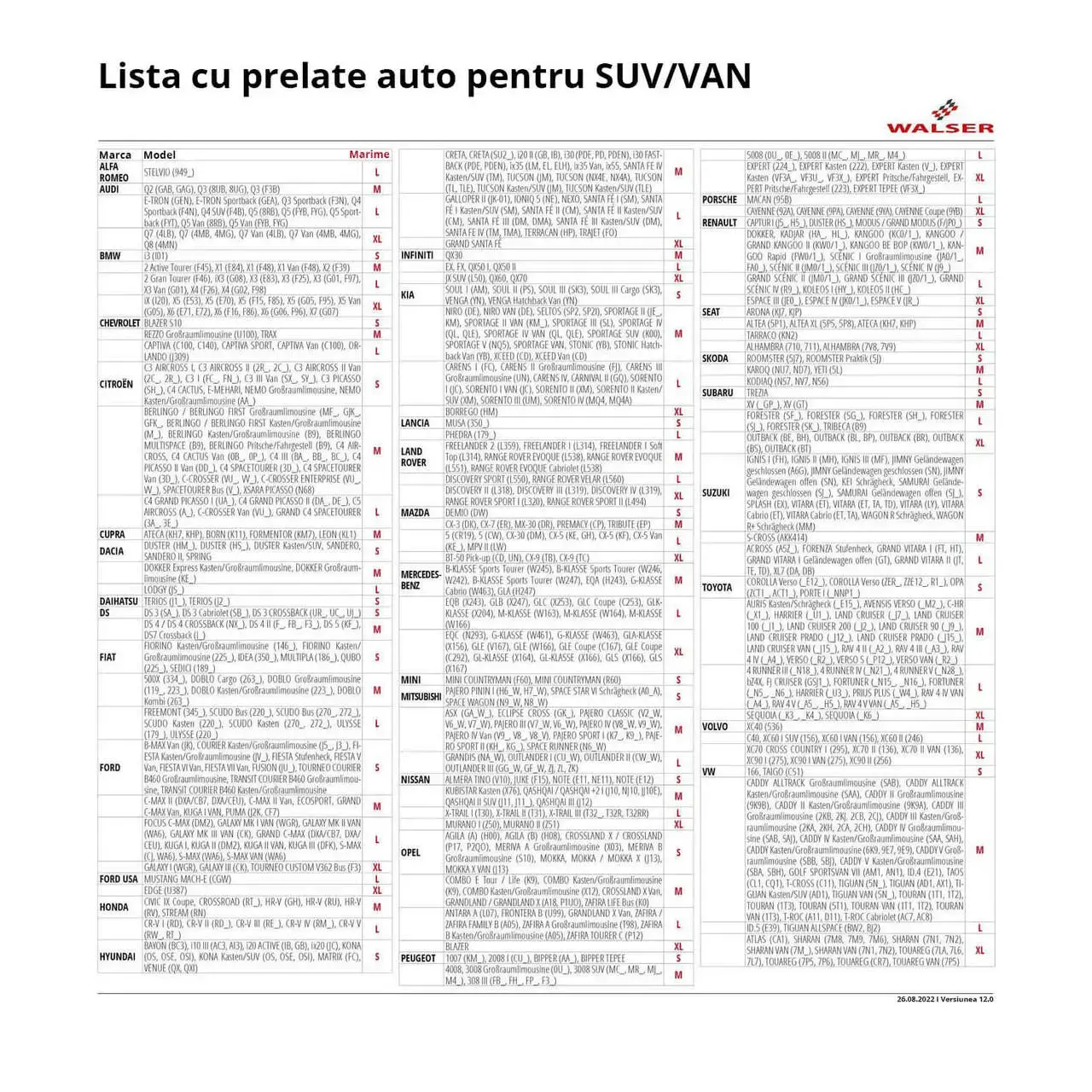 Mai jos gasiti lista masinilor compatibile cu aceasta marime a prelatei.