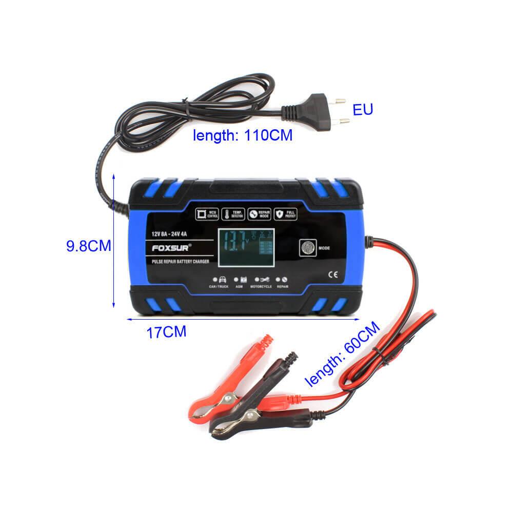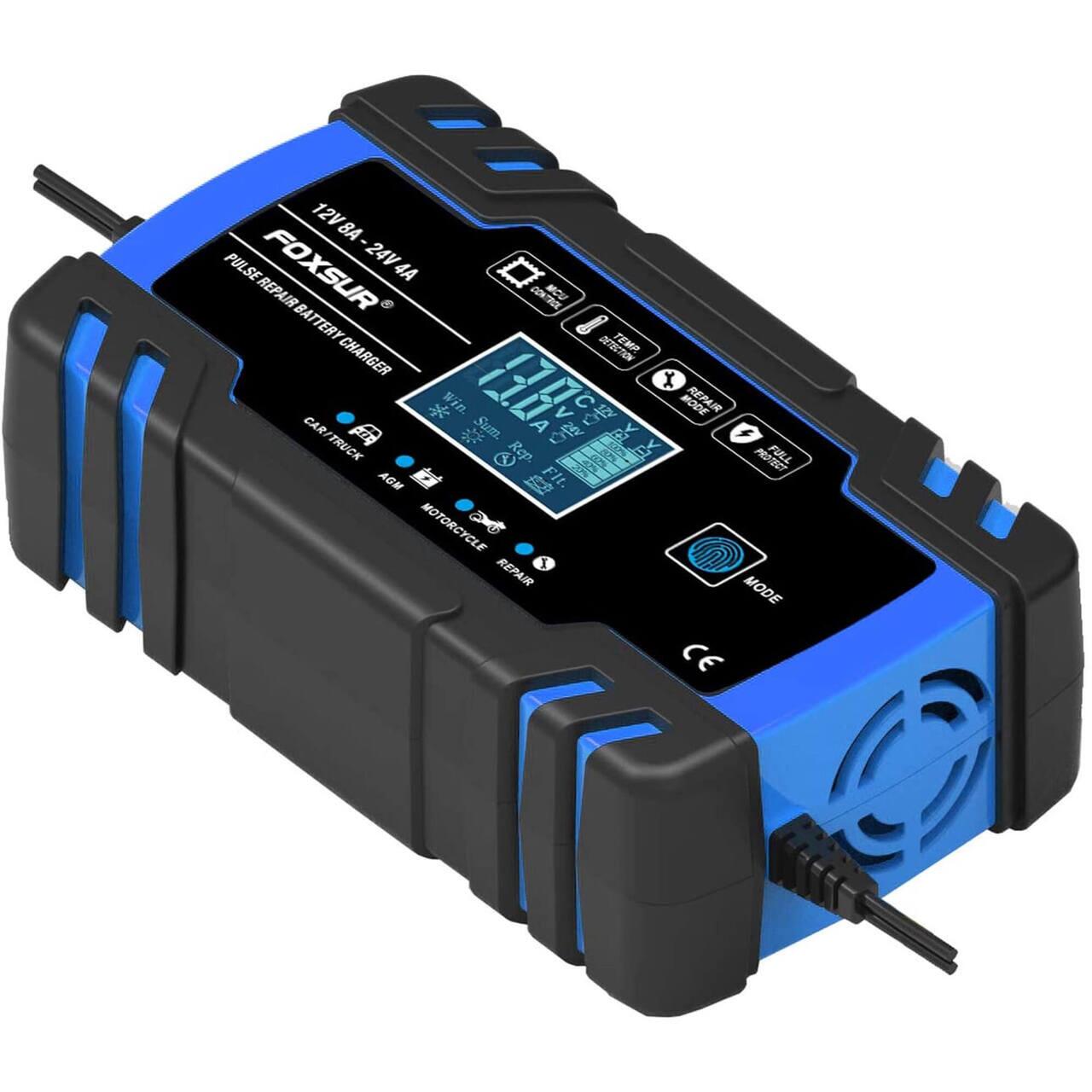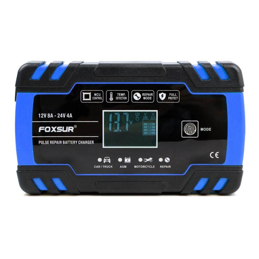 Redresor auto digital, incarcare baterii cu afisaj LCD, auto, moto, camion, Foxsur, 12V/8A, 24V/4A, 6Ah-150Ah, functie de reparare acumulator prin impulsuri, albastru cu negru