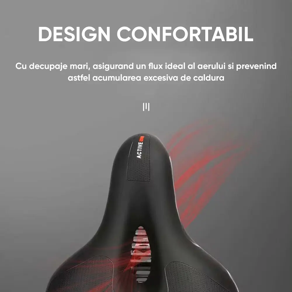 - Materialul din care este confectionata saua este impermeabil, iar decupajul din mijlocul ei asigura un flux ideal al aerului, prevenind astfel acumularea excesiva de caldura.