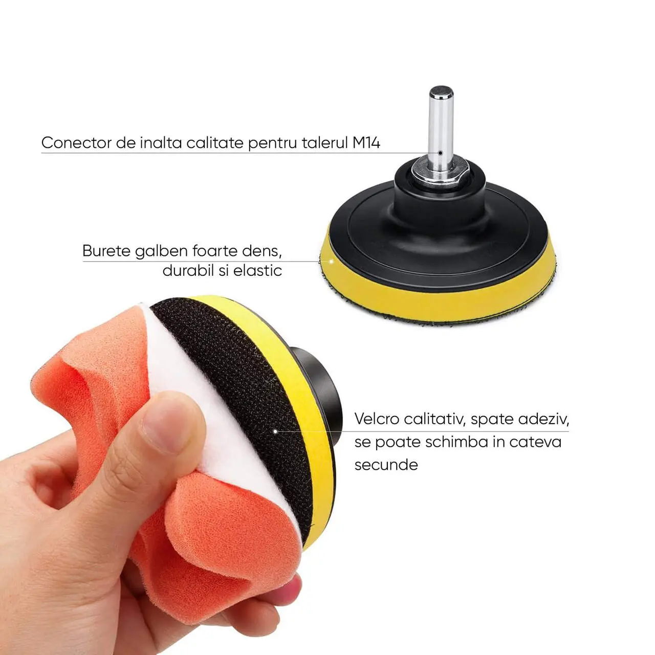 - Acesti bureti se ataseaza cu velcro de discul inclus in set.