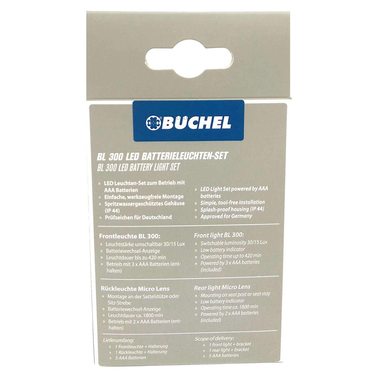 - Setul de iluminare pentru bicicleta de la Buchel dispune de o tehnologie bazata pe LED-uri ce ofera o lumina de intensitatea maxima de 30 lux.
