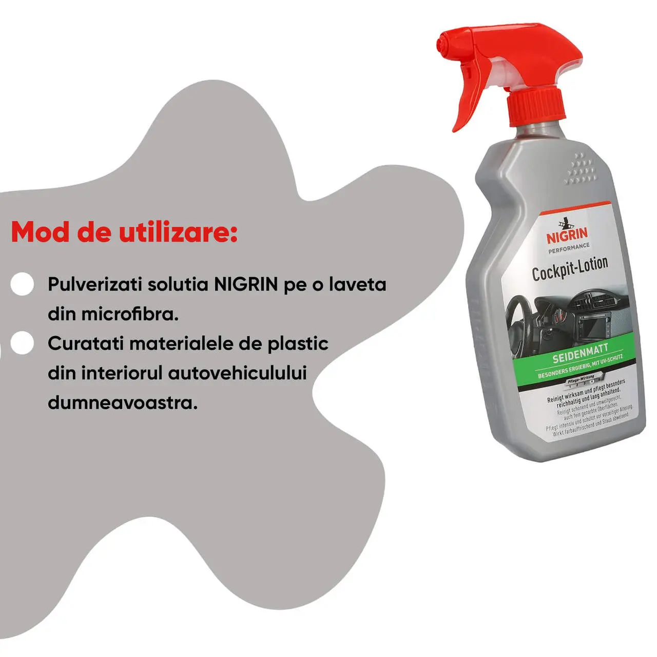 Intretineti interiorul masinii tale cu solutia de curatare pentru bord Cockpit-Lotion de la Nigrin Performance.