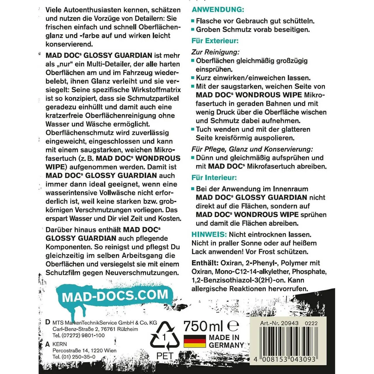 - MAD DOC's GLOSSY GUARDIAN Waterless este mai mult decat "doar" un multi-detailer care invioreaza simplu si rapid stralucirea si culoarea suprafetelor, are efect de conservare.