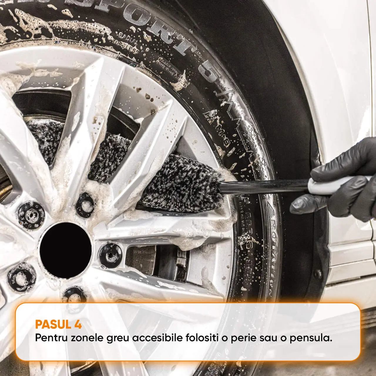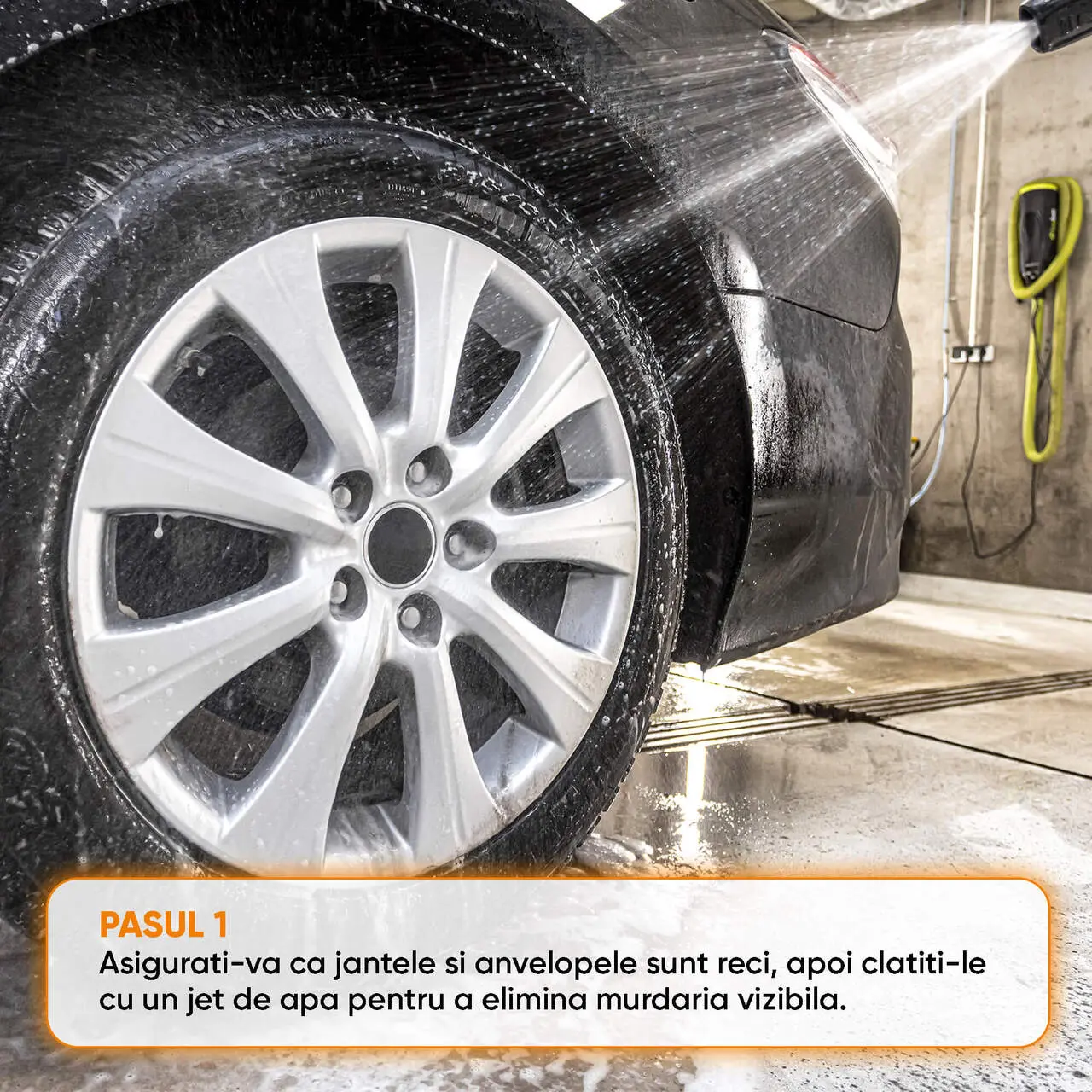- PASUL 1: Asigurati-va ca jantele sunt reci. Clatiti-le cu apa pentru a indeparta murdaria, noroiul, nisipul etc.